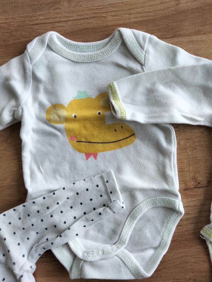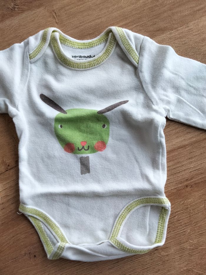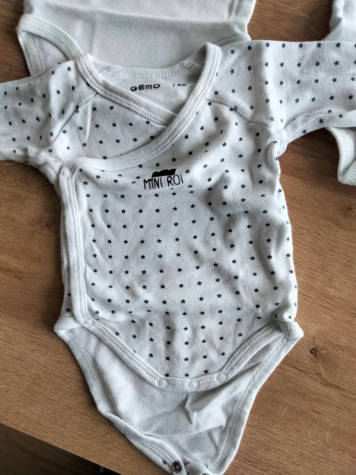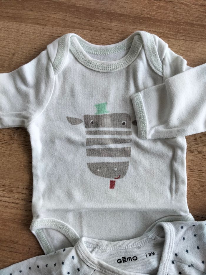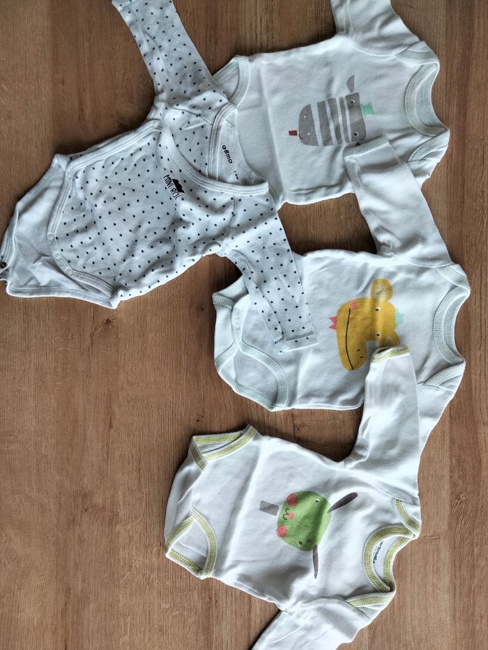 3 bodies manches longues de la marque Vertbaudet 1 body manche longue de la marque GEMO Il est écrit que c'est de taille 3 mois mais ça taille très petit!