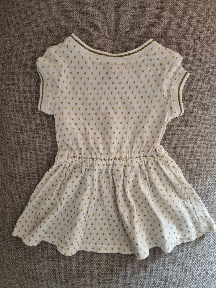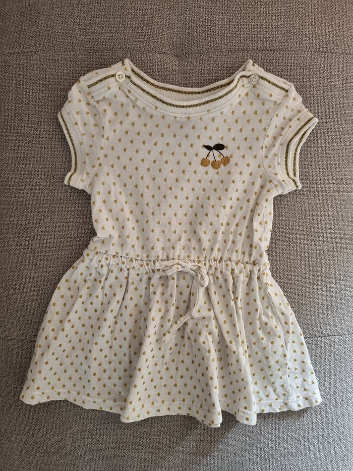 Très belle robe Orchestra, blanche avec des pois dorés pailletés. Taille 9 mois, 71 cm.