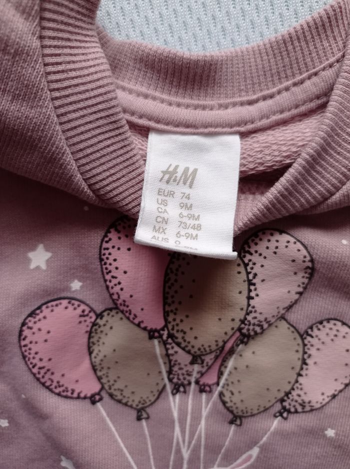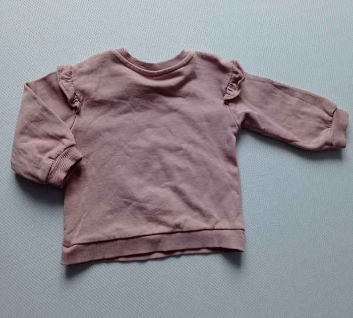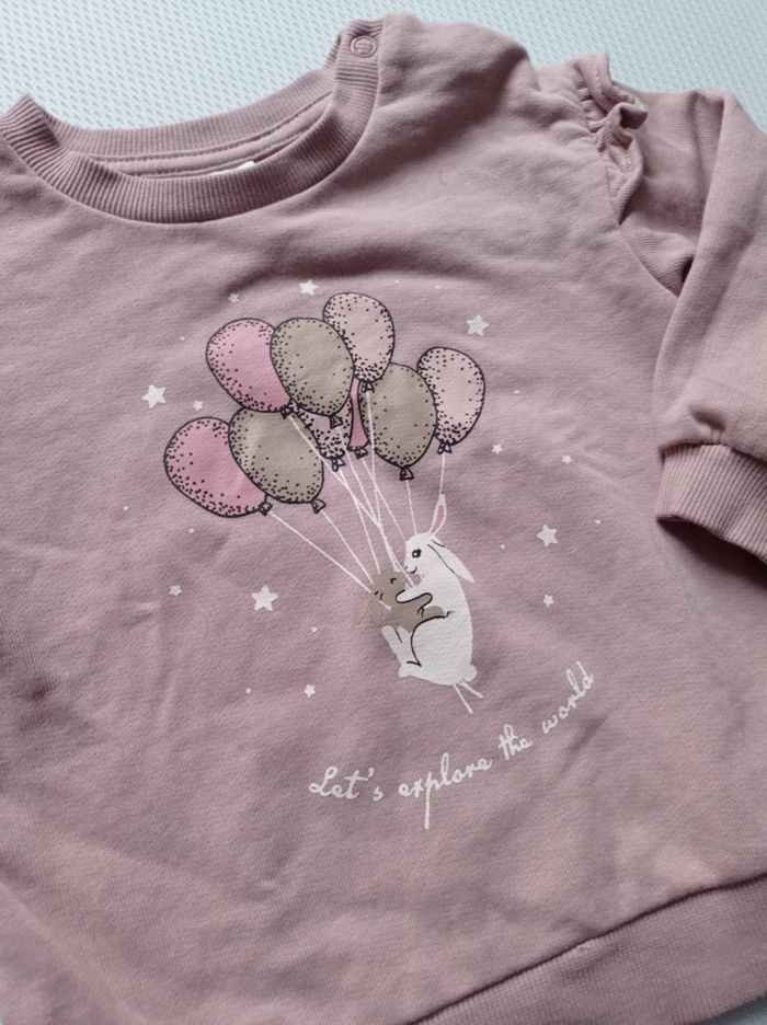 Sweat coton Vieux rose dessin lapins portés par des ballons Volants aux épaules Pressions épaule gauche H&M 12 mois