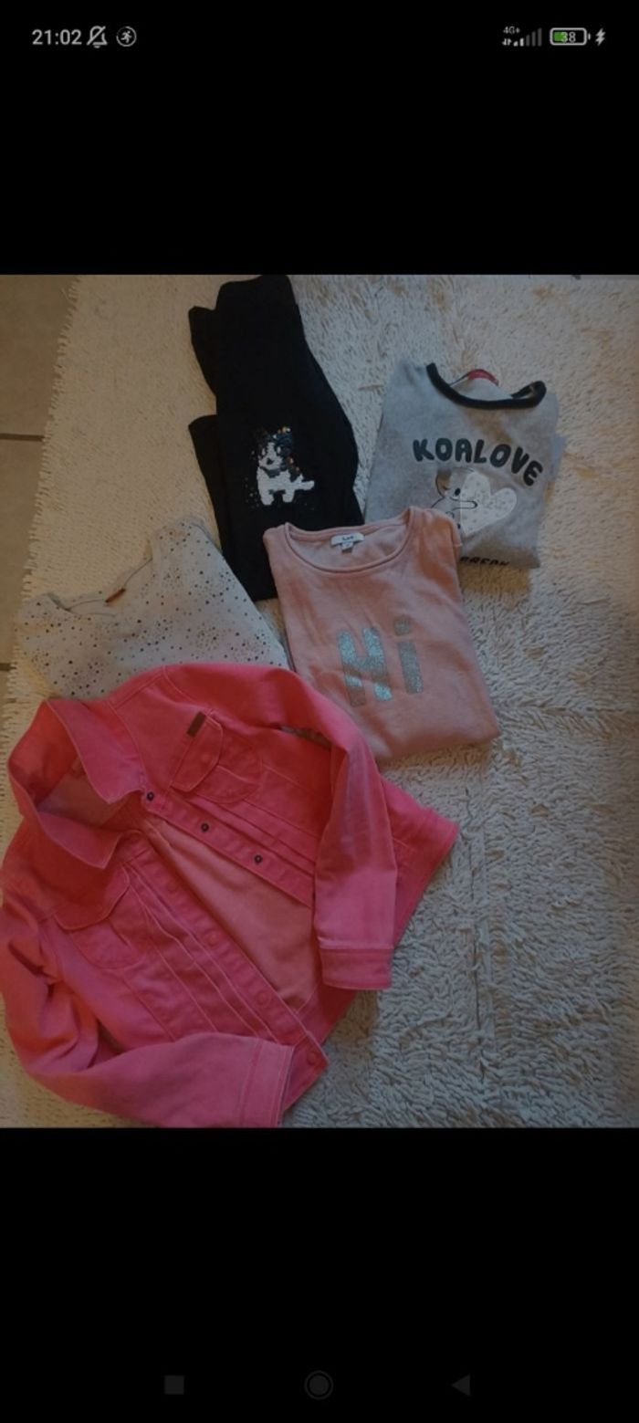 Veste en jean avec 2 petites tâches, legging avec sequins réversibles, un haut de pyjama tout doux, un pull fin avec petite tâche rouge à la manche, un petit sweat à cœurs avec petite tâche à la manche également. #lot #lotfille #lotfille12ans #fille12ans #lot12ans #legging #chien #sequins #sequinsreversibles #pyjama #hautdepyjama #pyjamahiver #automne #hiver #automnehiver #sweat #sweatcoeurs #pullb#pullfin #printemps #rose #vesteenjean #lahalle #tissaia #tapealoeil #nameit #jennyferbouget12ansfille