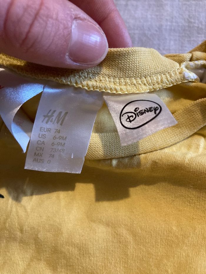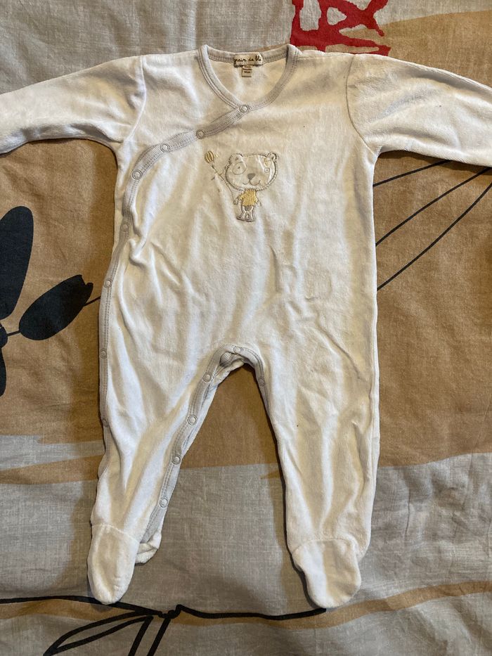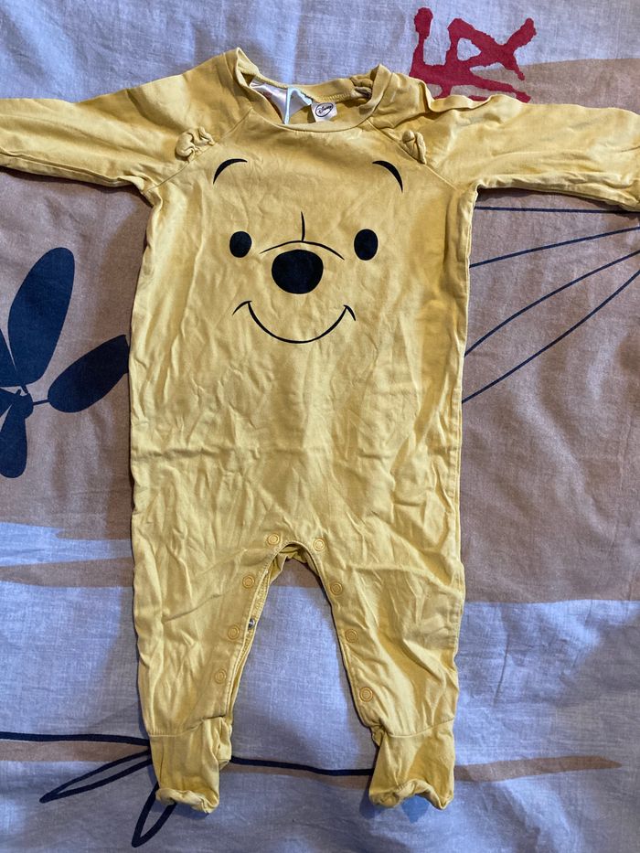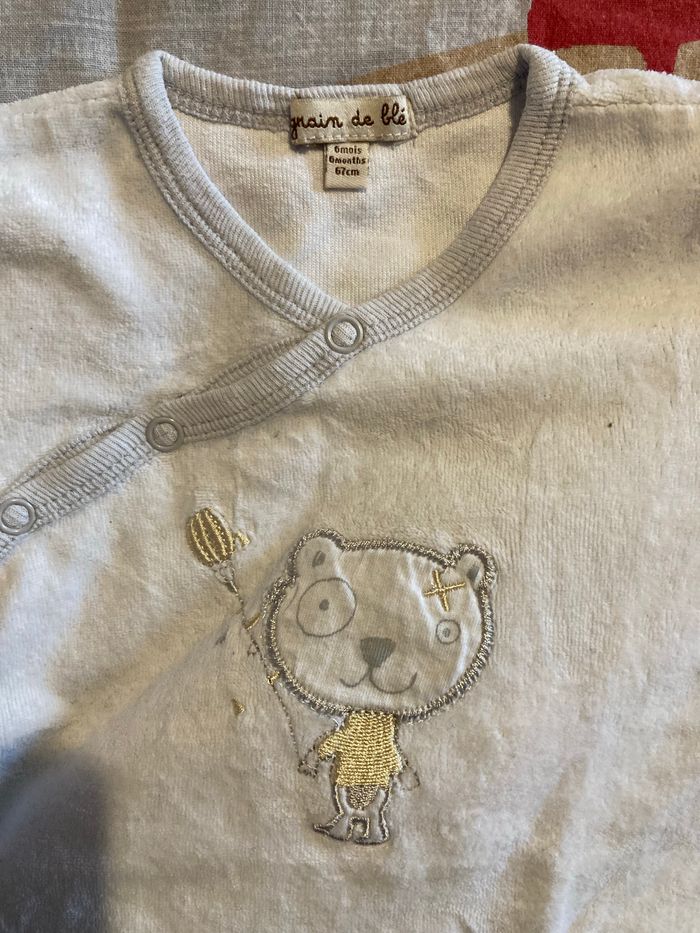 Lot comprenant 2 pyjamas taille 6 mois: - 1 blanc épais manches longues marque Grain de Blé en bon état - 1 pyjama léger Winnie l’ourson marque Disney par H&M présentant un petit trou recousu vers les fesses