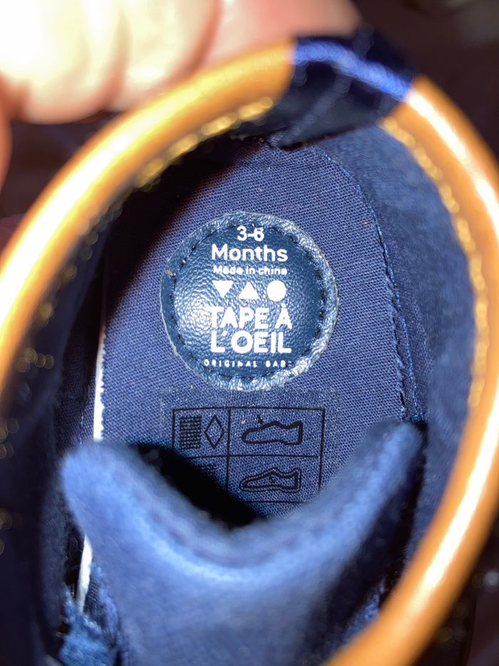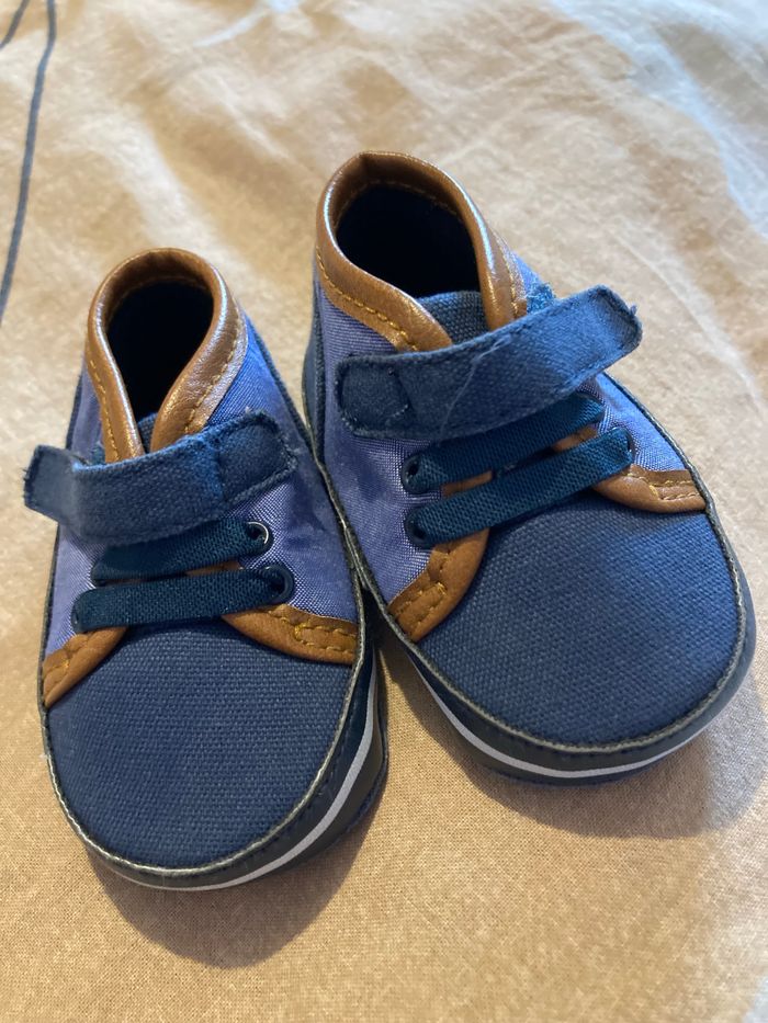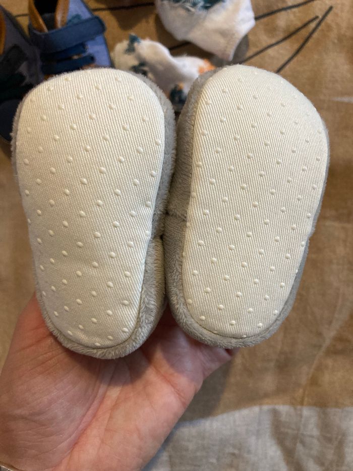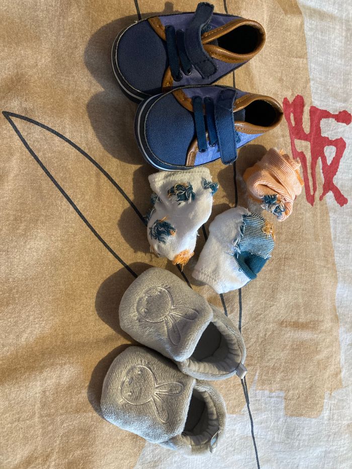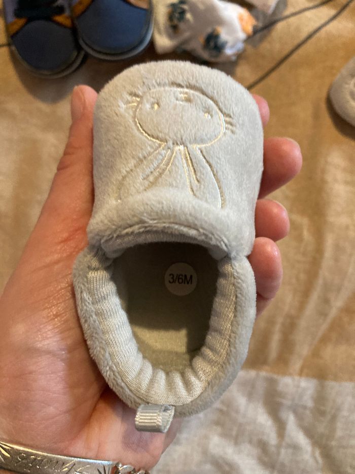 Lot comprenant: - 1 paire de chassures marque Tape à l’œil taille 3-6 mois - 1 paire de chaussons gris Kiabi taille 3-6 mois - 3 paires de chaussettes obaibi taille 13-14
