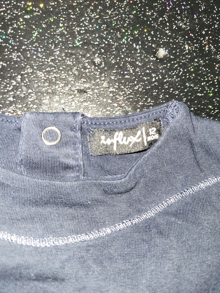 Tunique marine douce poésie serré à la taille avec un nœud rouge. Influx 12 mois.