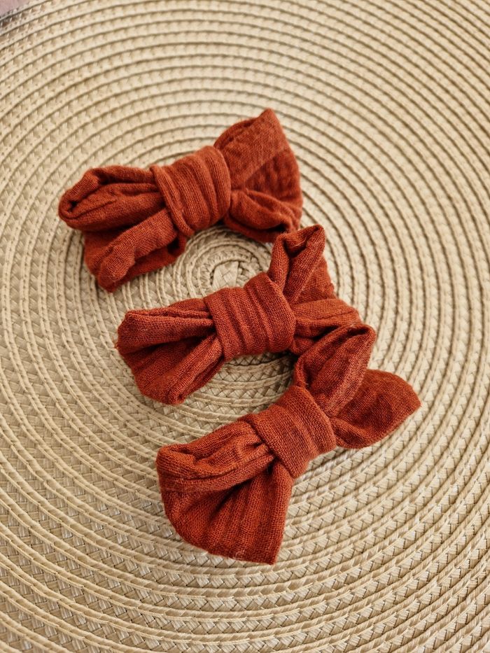 Nouveauté : la barrette nœud ! Je vous proposes des lots de jolis nœuds en double gaze. Elles se fixent grâce à des pinces clic clac. La taille est d'environ 7cm de longueur sur 3cm au plus large du noeud. Prix du lot de 3 barrettes : 6€