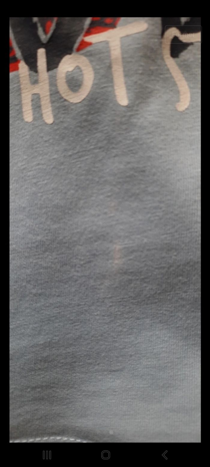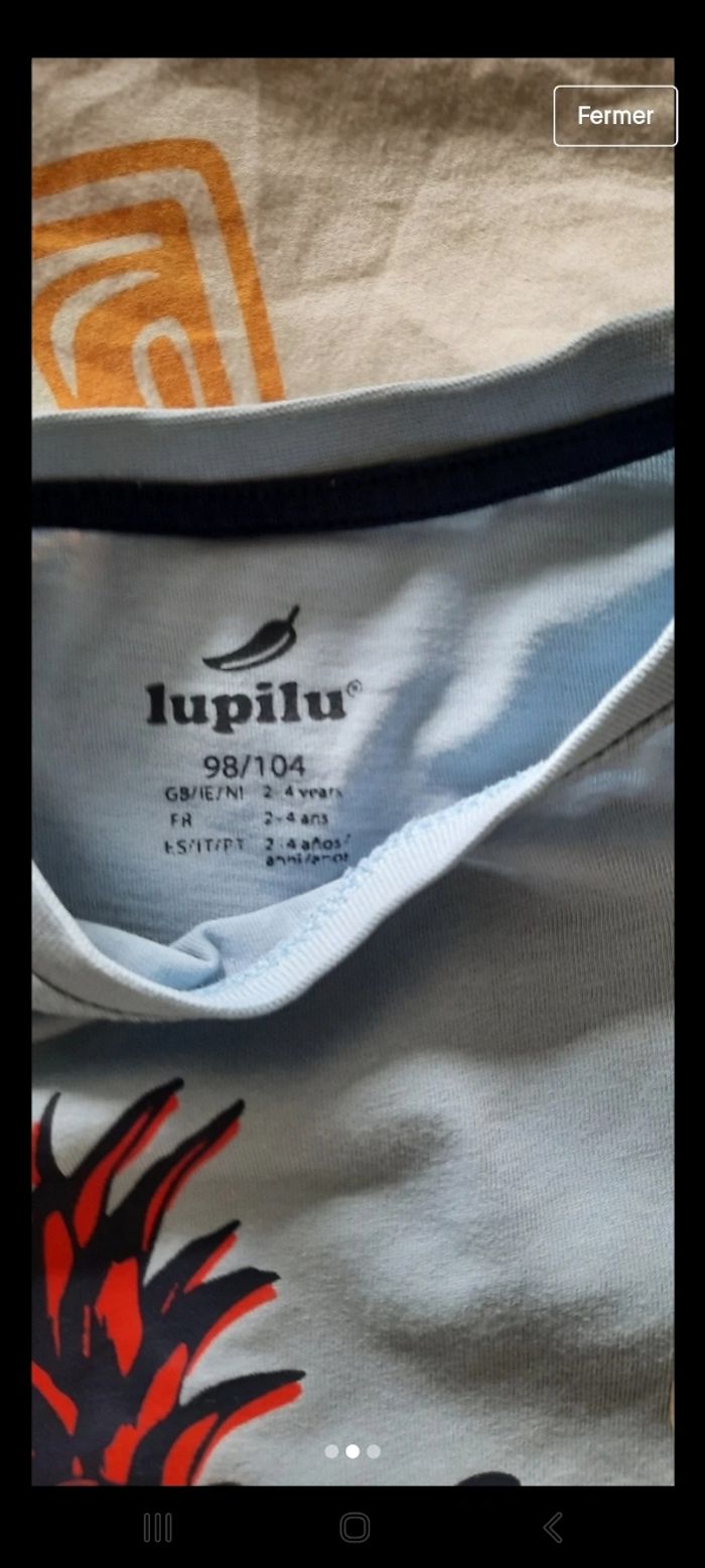 T shirt manches courtes taille 2/ 4 ans 98/104 cm marque lupilu. Pas de tache ni de trou juste une tâche blanche sur le devant( cf photo) . je l ai acheté neuf comme ca ( problème de pigmentation du tissu peut être )