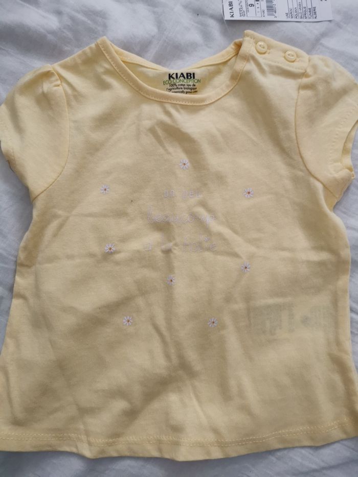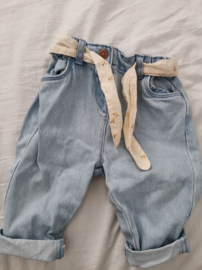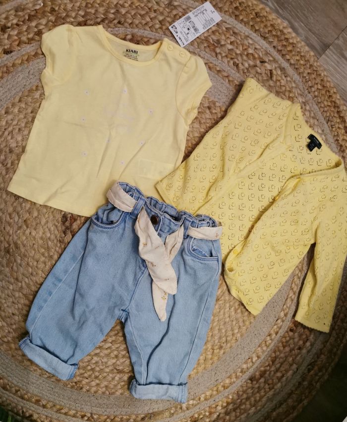 * T-shirt manches courtes jaune clair (neuf) * gilet ajouré jaune * jean large avec sa ceinture
