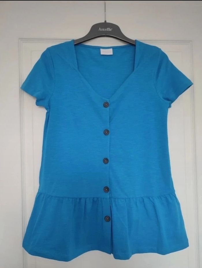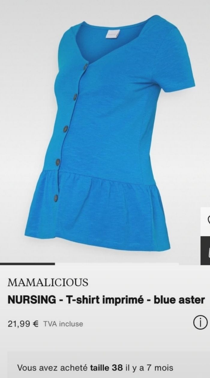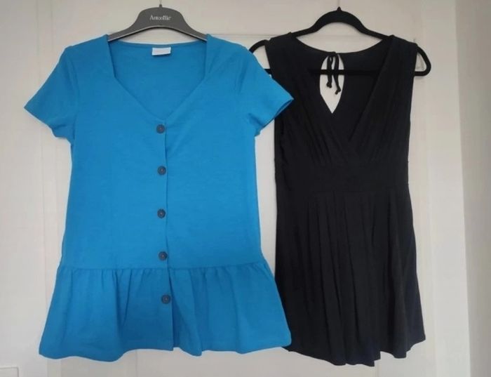 Le lot comprend un t-shirt en taille 38 Mamalicious bleu ( la dernière photo montre que c'est bien une taille 38 mais selon les marques et les pays c'est écrit S) et un débardeur taille 38 Kiabi Noir sans étiquette. Le bleu n'a jamais été porté, le noir 2 fois porté. Ils sont en excellent état.
