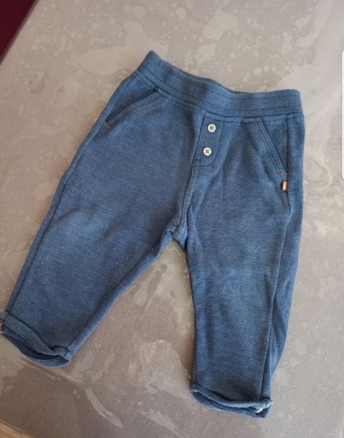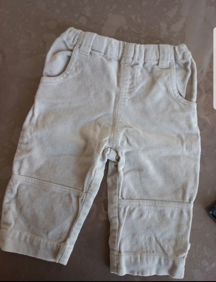 Lot de 3 pantalons 1 pantalon velours beige tbe noukkies 12 mois tbe peu porté 1 jean bleu coupe droite élastique au niveau de la taille 12 mois tbe peu porté 1 pantalon obaibi 12 mois en bon état (présente une décoloration au niveau des genoux)