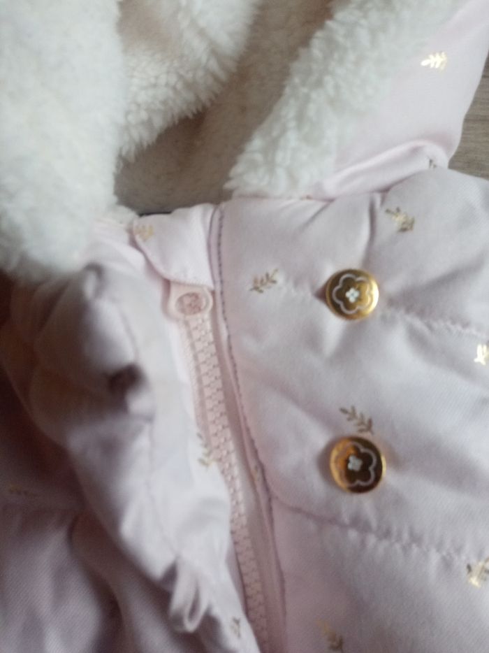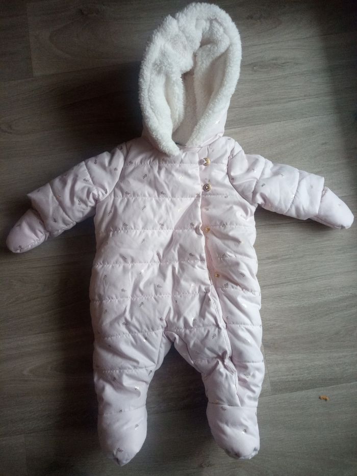 neuve, jamais portée. La capuche et les moufles intégrées aux manches sont fourrées dans une matière toute douce.