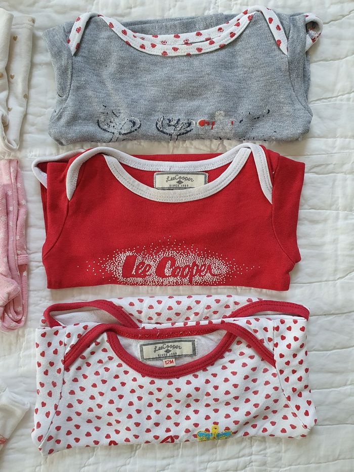 Lot en 12 mois fille 2 bodies Ă  bretelles Petit Bateau 3 bodies Ă  manches longues Lee Cooper 1 dors-bien 1 gilet Dpam