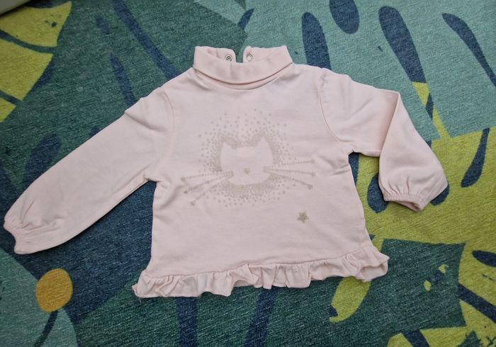 Beau Sous pull Marque : mes petits cailloux Matière coton Motif chat 🐱 Couleur rose et doré Taille 3 mois /62cm Très bon état