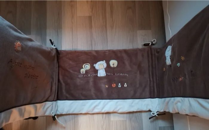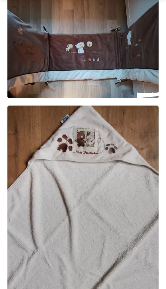 1 tour de lit bébé doublé + 1 couverture assortie 60x120cm + 2 capes de bain 100% coton Marque influx et mots d'enfants 1 face velours Propres et en parfait état