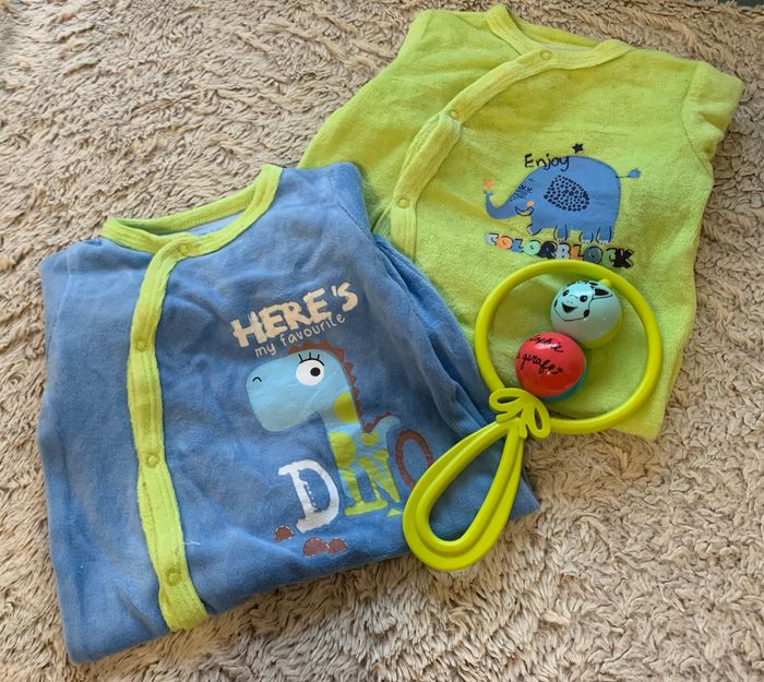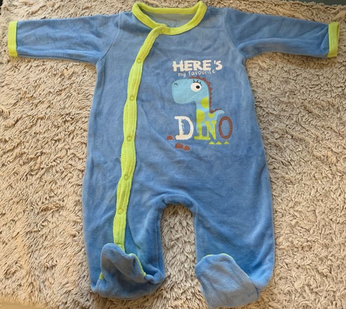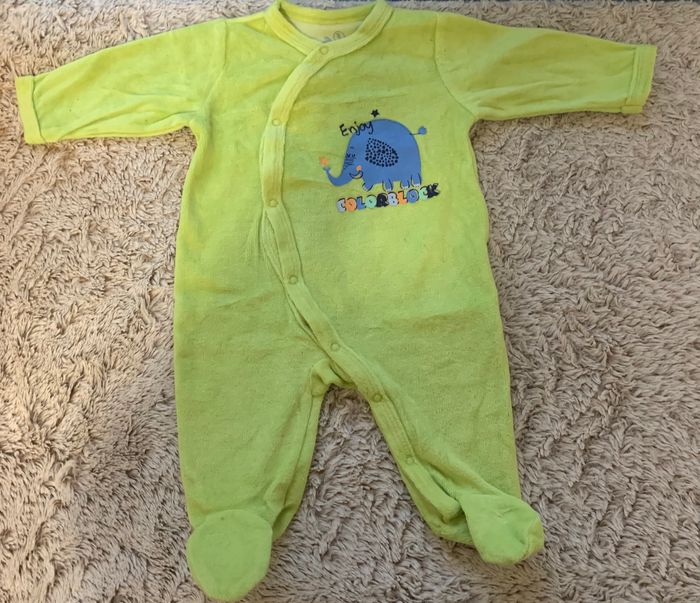 Lot de 2 pyjamas : • Un pyjama bleu avec un petit dinosaure 🦖 en excellent état • Un pyjama vert pommé avec un petit éléphant 🐘 en excellent état Tout deux en taille 3 mois, acheté à Auchan