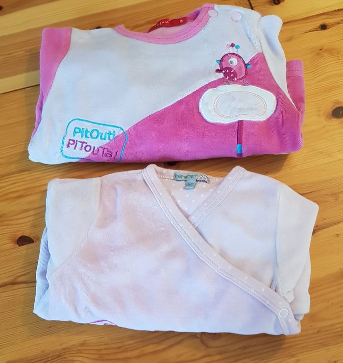 Lot de 2 pyjamas 2 pièces en velour Celui avec l'éléphant possède des boutons pressions qui permettent d'attacher le bas avec le haut pour former un pyjama 1 pièce Peu porté