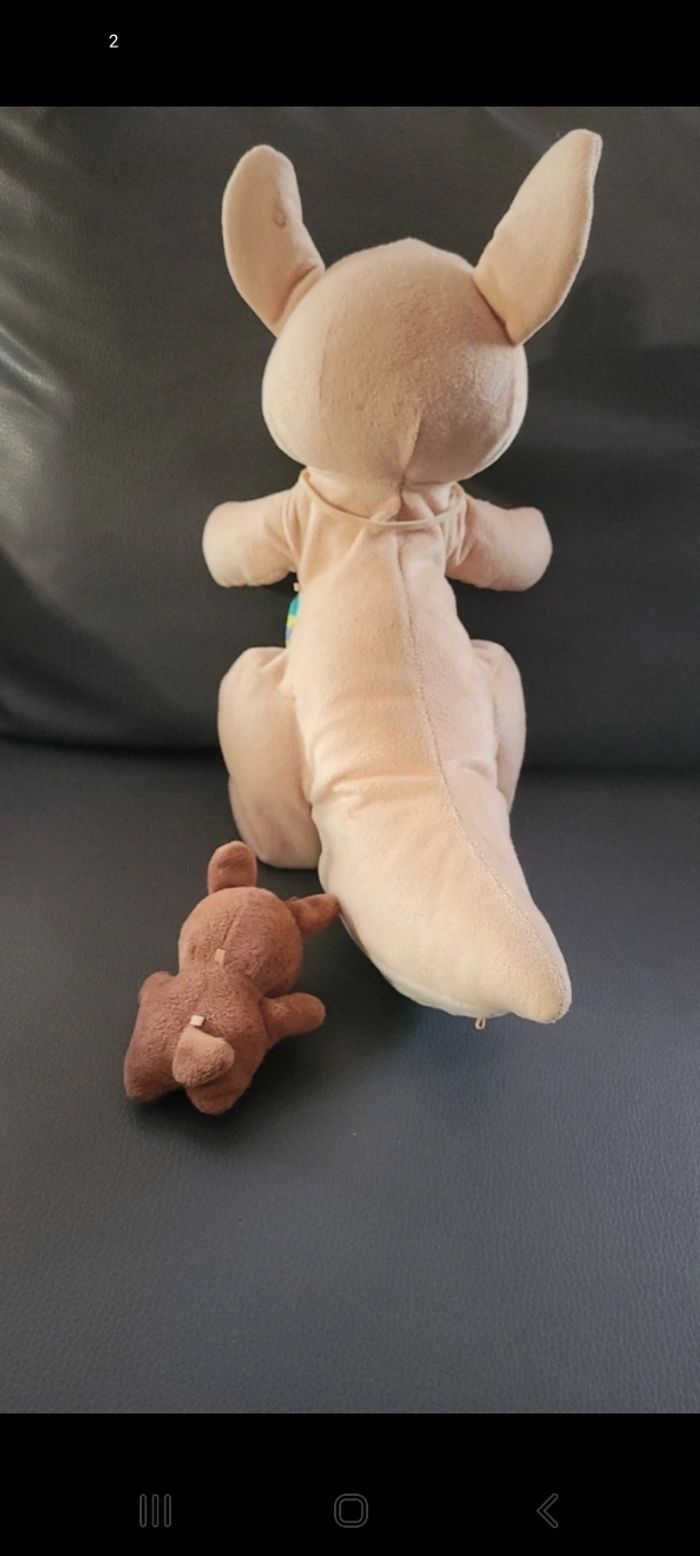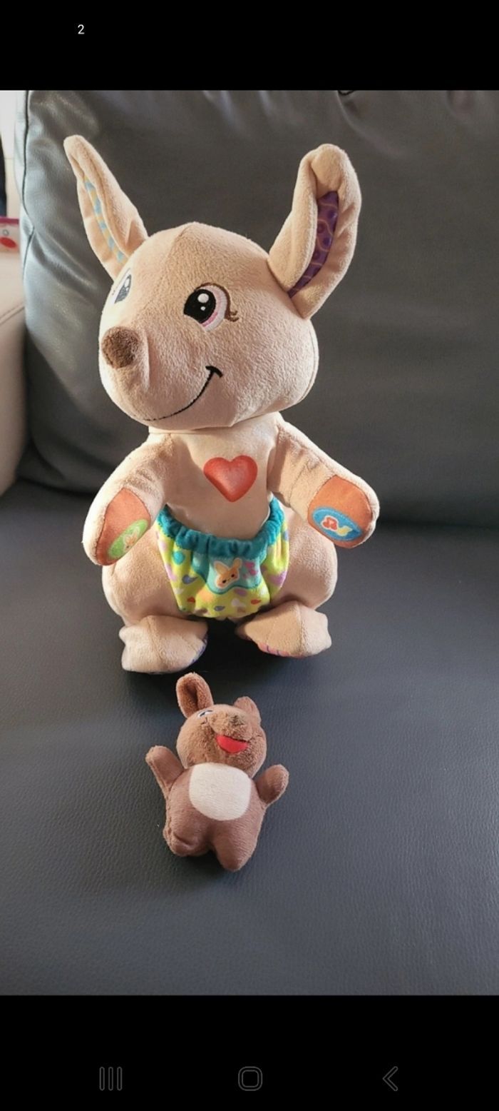 Très bon état Version française Prix entre 50 et 90 euros La peluche interactive Maman Kangourou avec son petit bébé dans sa poche convient aux enfants de 1 à 4 ans. Ensemble ils se déplacent, sautillent et chantent de belles chansons et mélodies. La peluche interactive Maman Kangou-Love a une poche magique qui reconnait lorsque son bébé y est à l’intérieure ou lorsqu’il est retiré. Si le bébé kangourou n’est pas dans la poche de sa Maman, le petit se met à pleurer. Maman Kangourou et son bébé ont des boutons interactifs qui permettent d’animer les deux peluches animaux, et ainsi faire découvrir à l’enfant les formes et les couleurs. Les boutons interactifs permettent d’activer un des modes de jeu : Bouton « Musique » pour entendre Maman Kangou-Love et son bébé chanter, Bouton « Kangourou » pour découvrir les chiffres, des anecdotes et entendre des sons amusants, Bouton « Cœur » pour entendre les peluches se dire de douces phrases et introduire les émotions. Les peluches interactives Maman Kangou-Love et son bébé savent faire plus de 50 sons, 3 chansons et 10 mélodies, ainsi que des vraies phrases. Ils fonctionnent avec 4 piles LR6 AA incluses. #palest1_jouetbebe