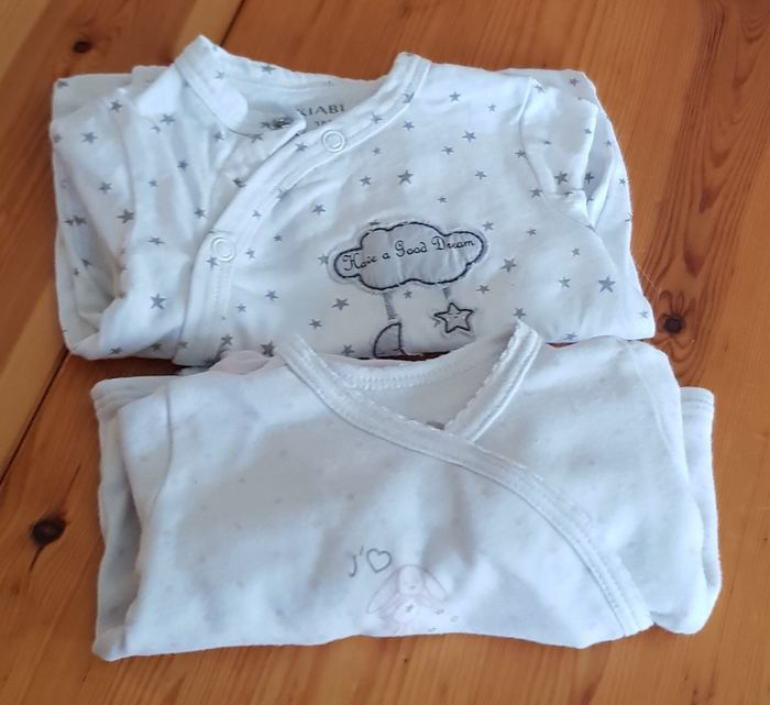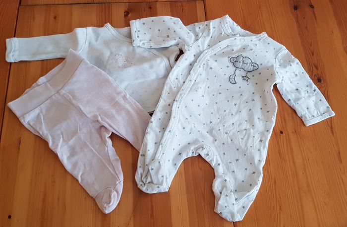 1 pyjama 2 pièces et 1 pyjama 1 pièce Taille grand, marqués en 1 mois mais correspond à du naissance Peu porté