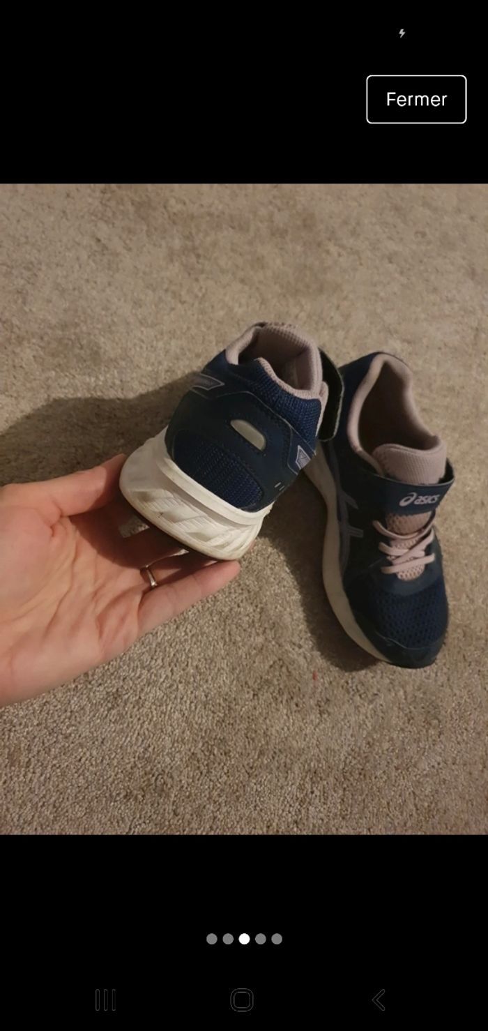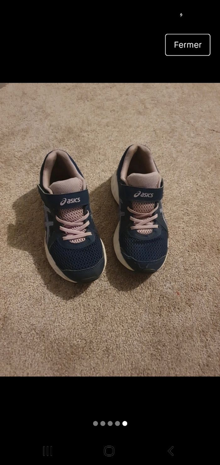 Basket Asics en très bon état bleu marine et parme . Semelle en très bon état Taille 33.5basket