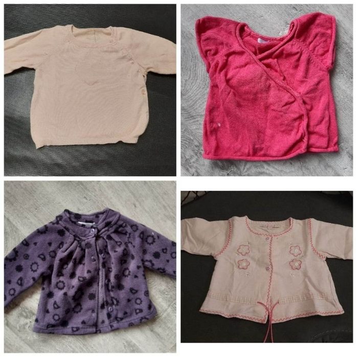 Bonjour vend lot de 4 gilets/veste en 6 mois - 3 articles en très bon état - 1 articles en bon état Un gilet avec les fleurs (petite tâche)