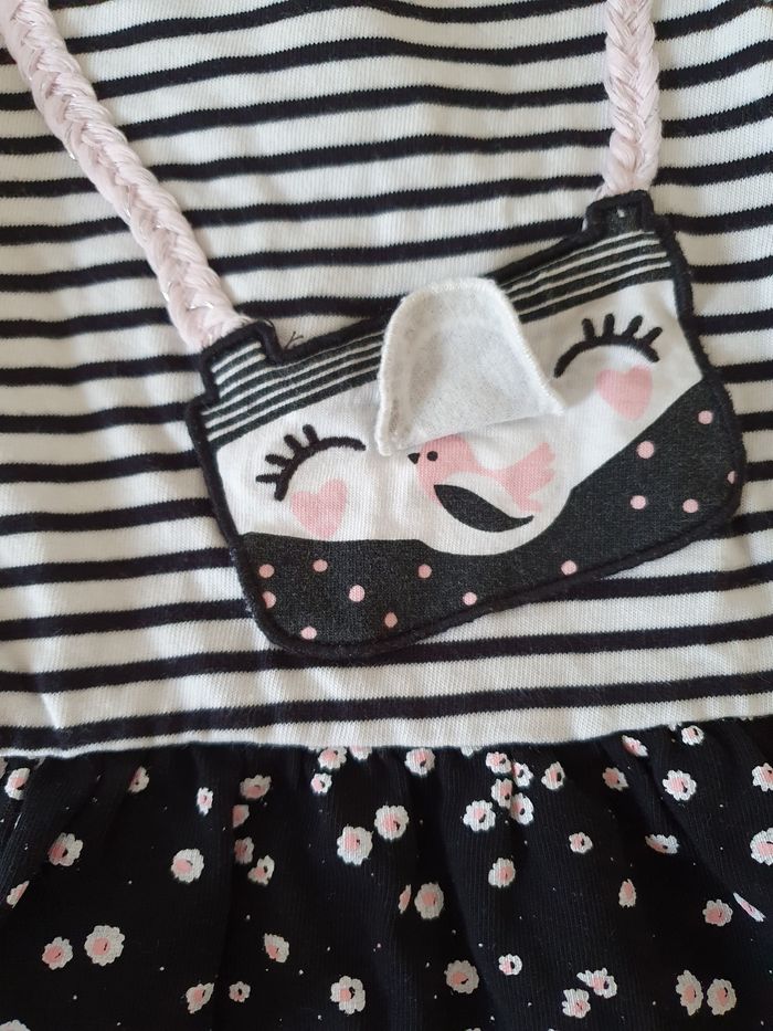 Robe noire et blanche avec motif appareil photo en bandoulière. Flap tissu qui se relève pour voir le petit oiseau! Très bon état.