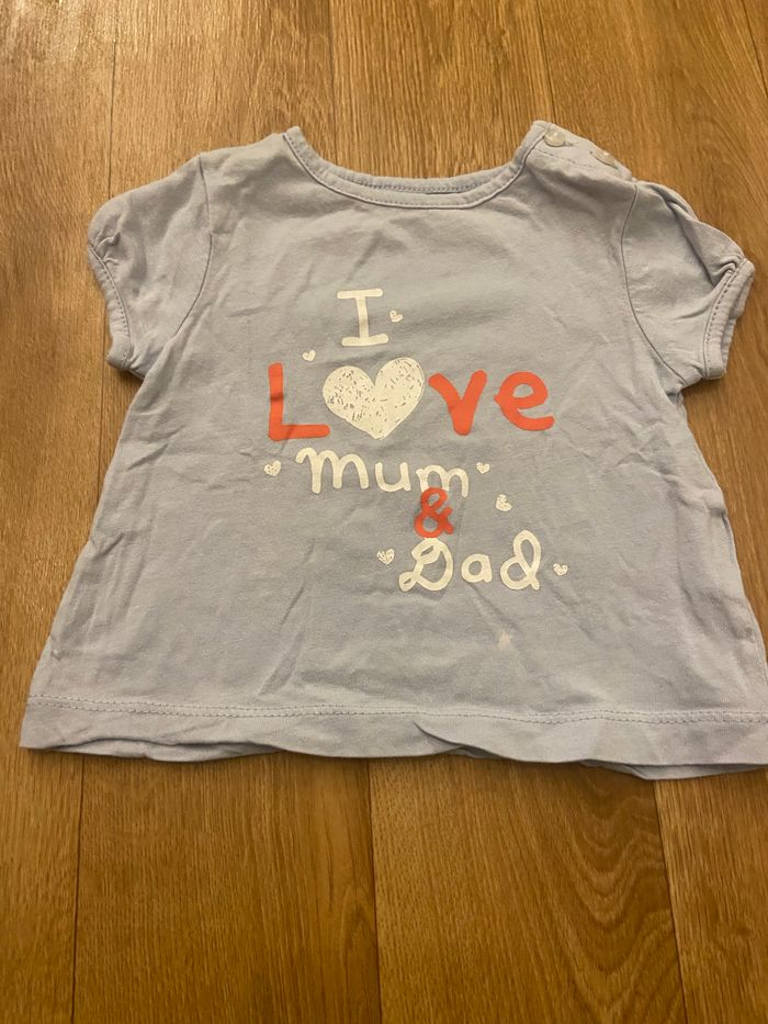 Je vends ces 4 t-shirt bébé 3 mois Marques diverses 1 blanc Chicco 1 blanc /rose a col 1 bleu mum dad 1 blanc imprimé nounours