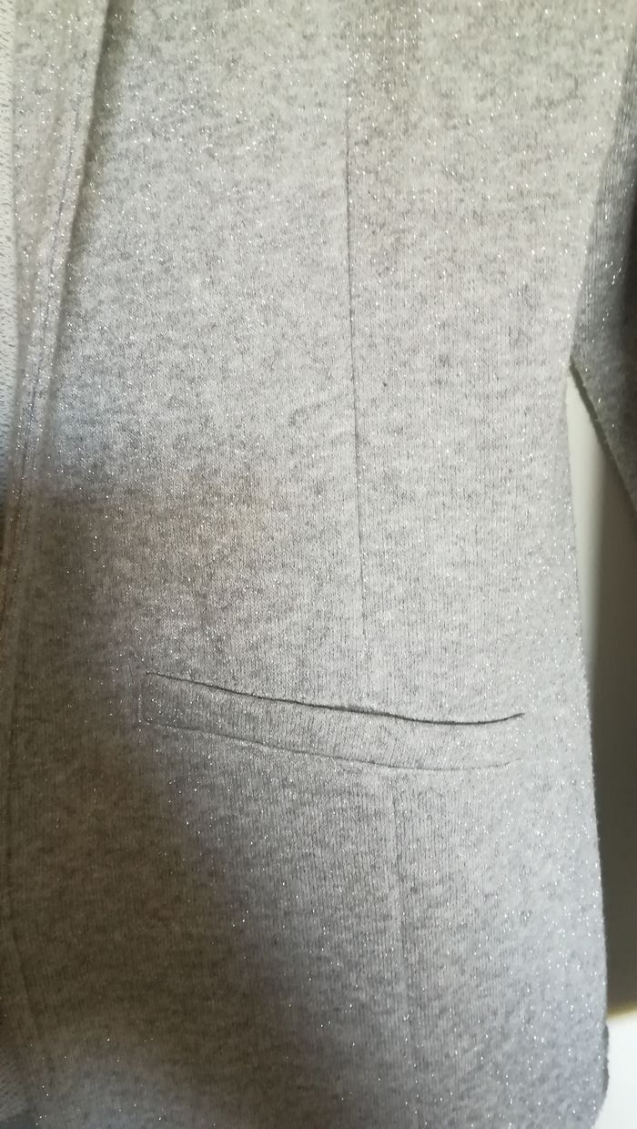 Veste blazer mi-saison en coton gris pailleté. Fausses poches décoratives sur l'avant de la veste. Taille 13-14 ans. Très peu portée, comme neuve.