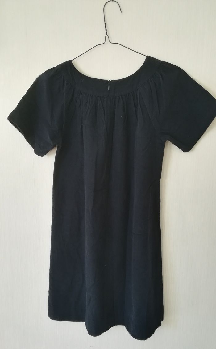 Robe velours bleu marine légèrement évasée. Détails blancs brodés autour du col. Fermeture éclair dans le dos.