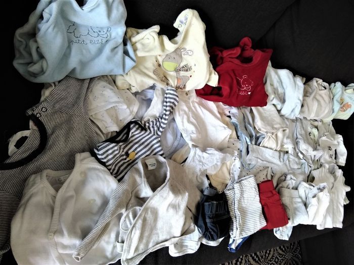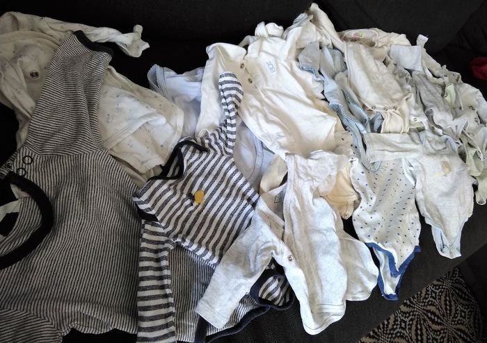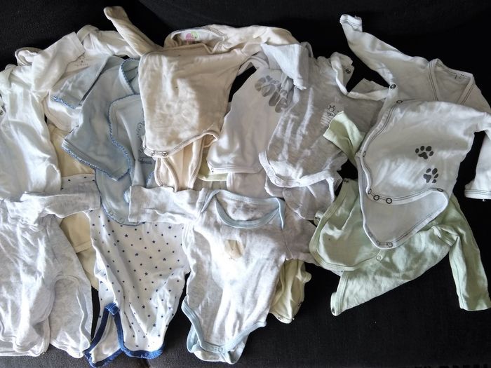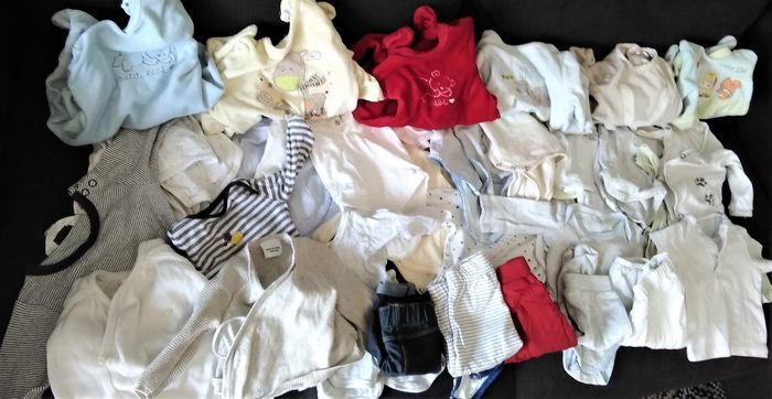 Vêtements bébé taille 1 mois: 6 pyjamas 5 pantalons 2 gilets 1 teeshirt 18 bodys Vente du lot entier uniquement, je cherche à me débarasser rapidement des tailles que mon fils ne peut plus mettre Relavés pour la vente