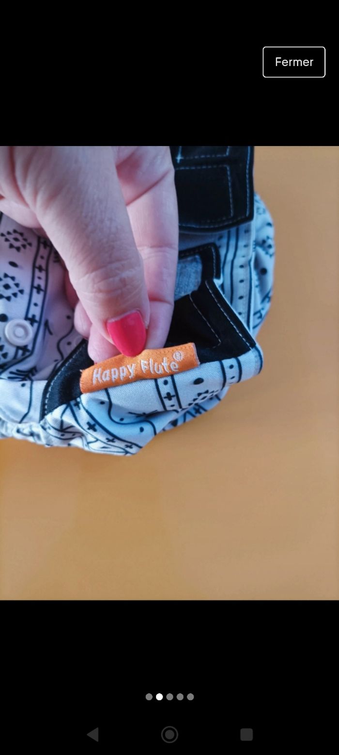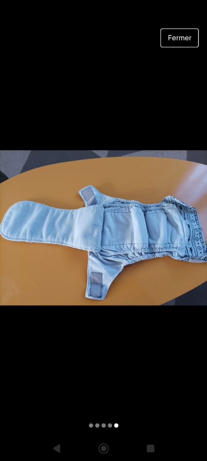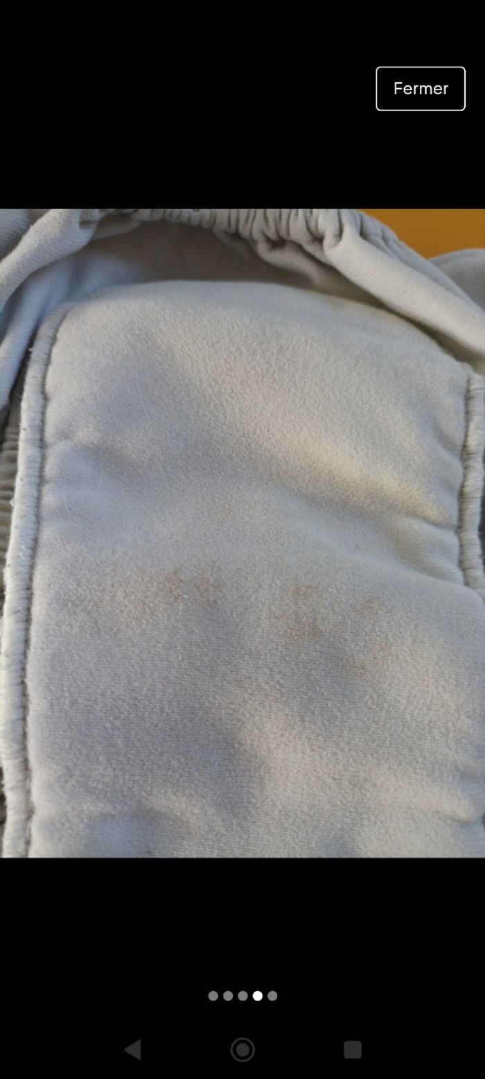 Couche lavable de la marque bambino mio Servi pour un seul enfant Élastiques en très bon état Scratchs en bon état Un décrassage a été fait mais faites en un aussi par sécurité. Une petite tâche voir photo suivante