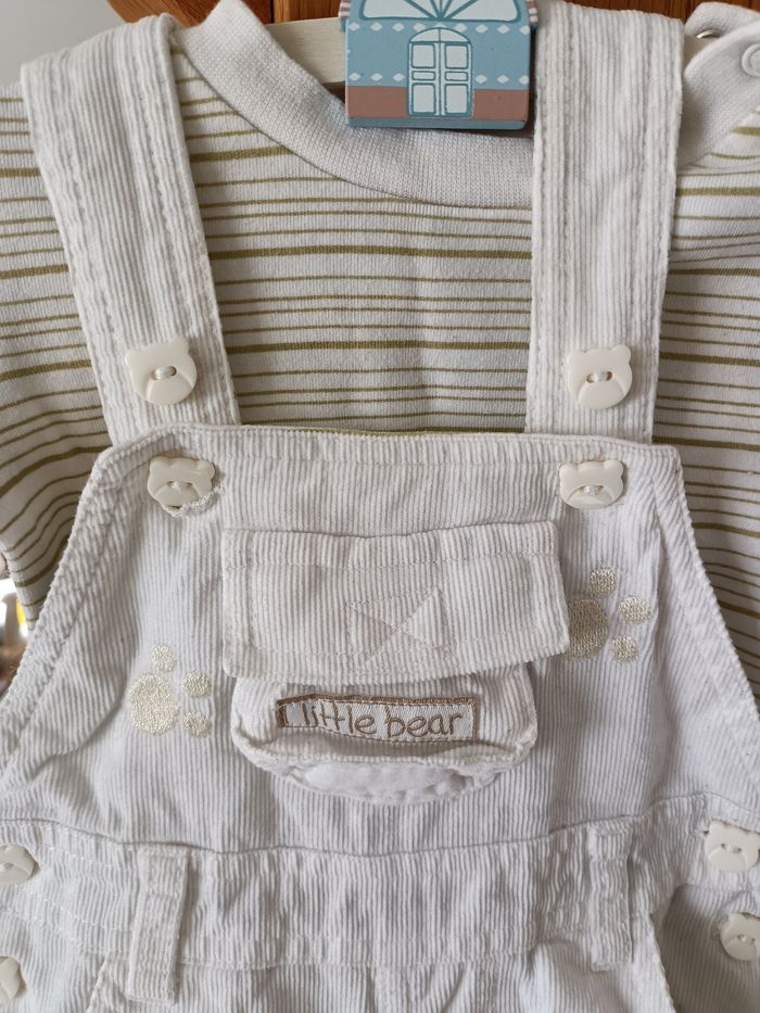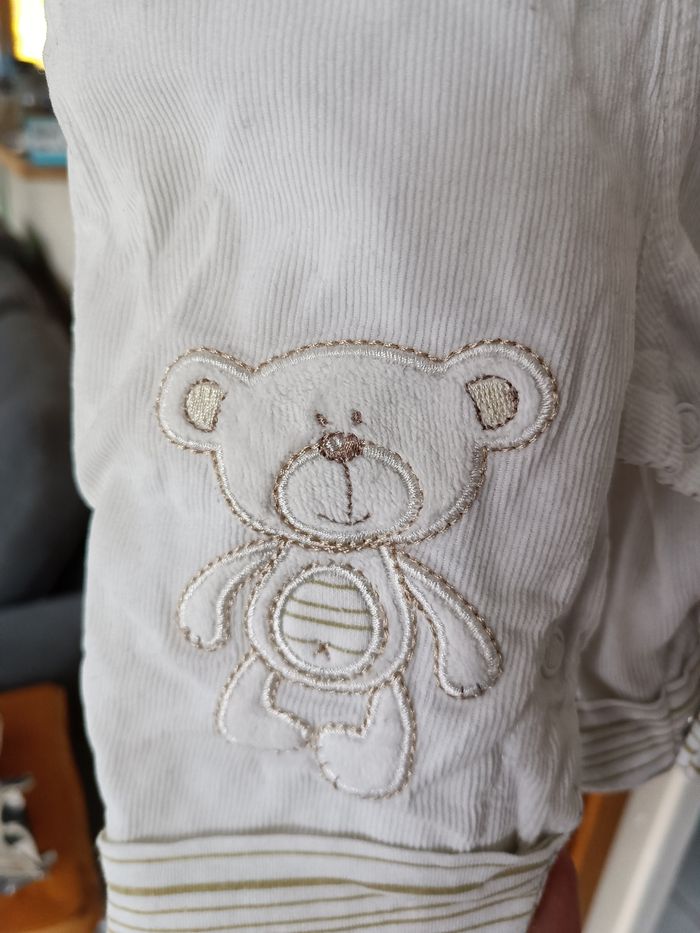 T-shirt manches longues à rayures Salopette en velours côtelé blanc avec poches, boutons oursons, ouverture boutons pression par le bas Gilet épais avec capuche motif ourson