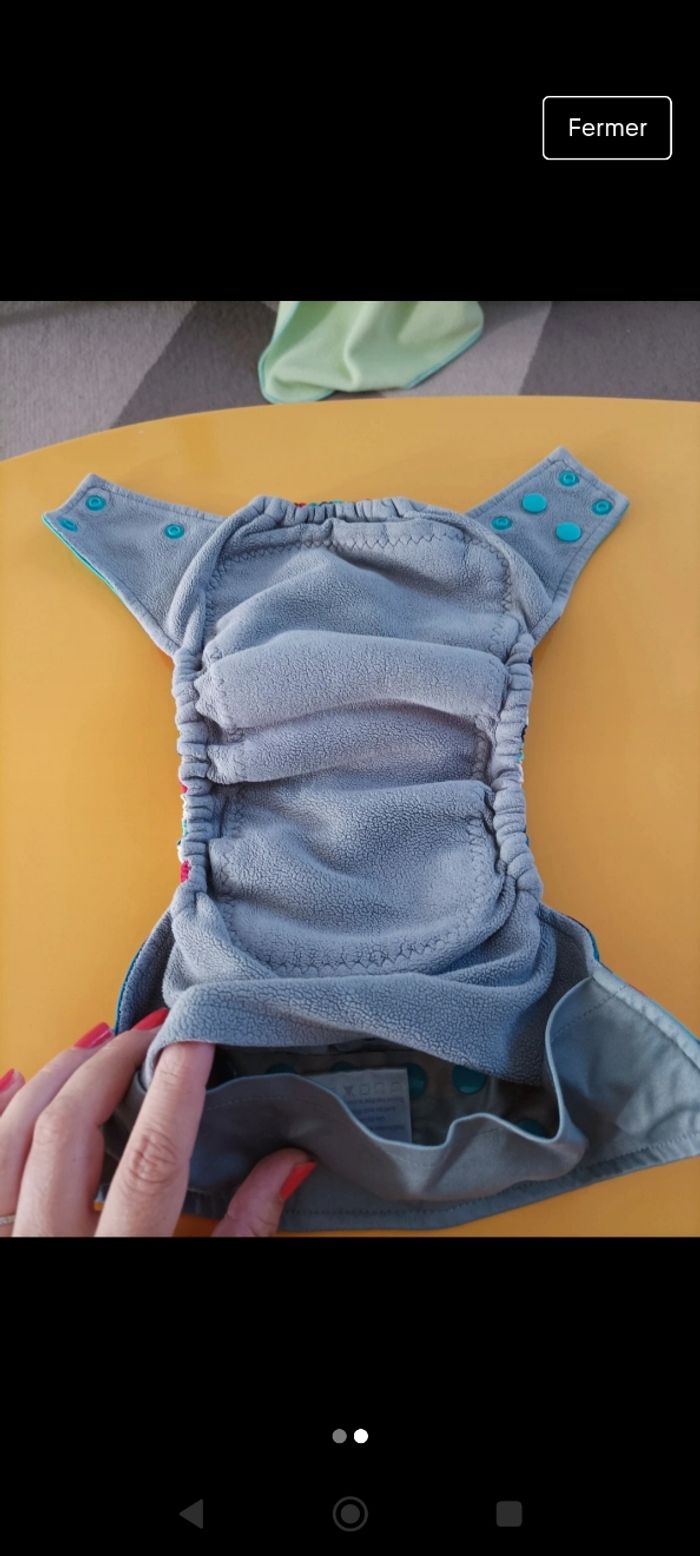 Couche lavable avec possibilité de mettre un insert en plus dedans Servi pour un seul enfant Élastiques en très bon état Pressions en bon état Un décrassage a été fait mais faites en un aussi par sécurité