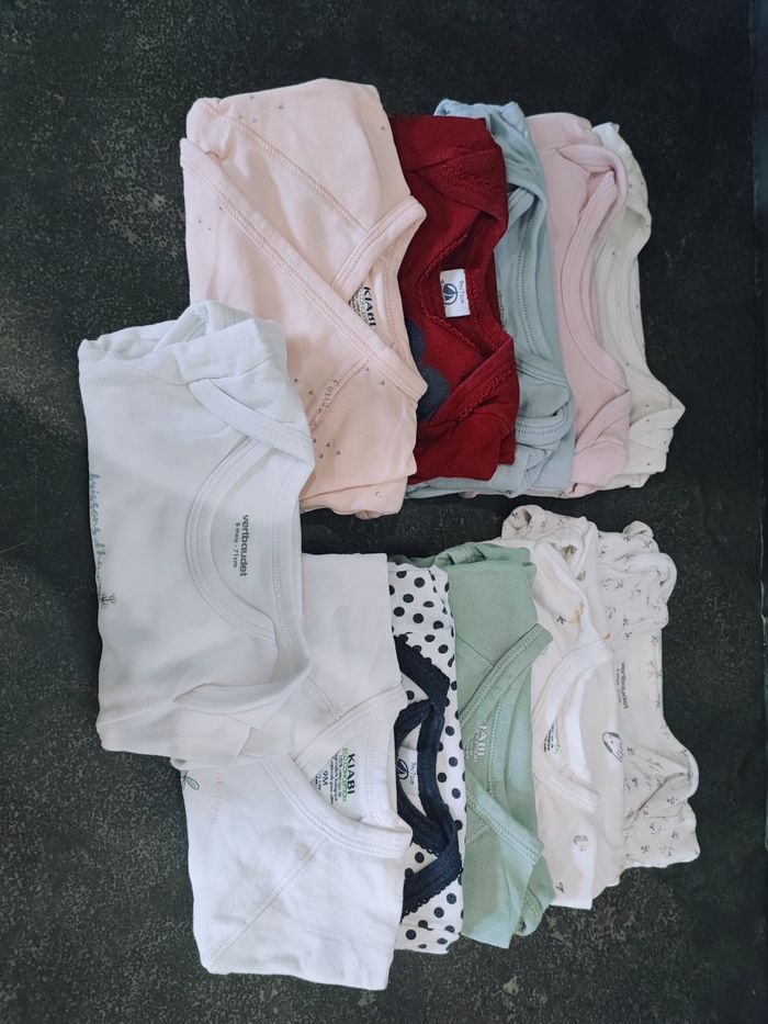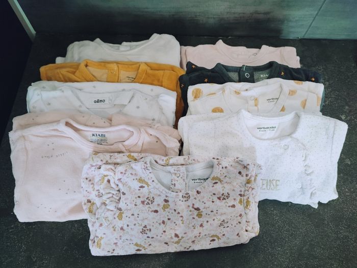 Lot de vêtements en très bon état. Ni tâche, ni trou. Taille 9 mois. 9 pyjamas + 11 bodys+ 9 bas + 5 paires de collants+ 10 hauts manches longues+ 2 pulls 1 ensemble robe-caleçon + 1 ensemble jogging+ 5 gilets. Plusieurs marques : obaïbi, sergent major, Verbaudet, Kiabi , Gémo, tape à l'oeil...