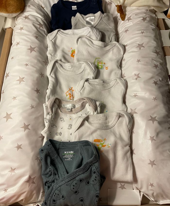 Bonjour, Lot de 9 mois en très bonne état, très peu porté -8 bodies de 1 mois -1 bodies de 0 mois