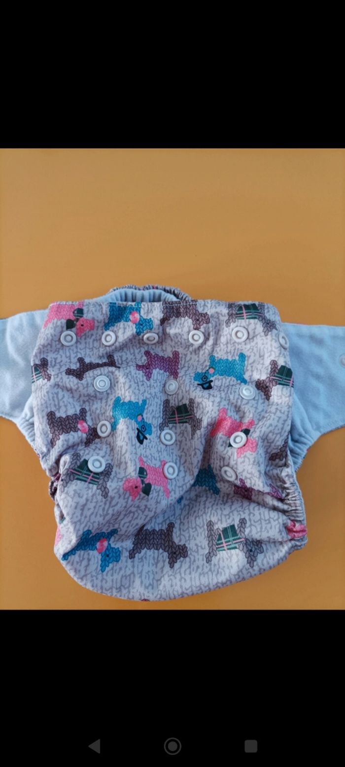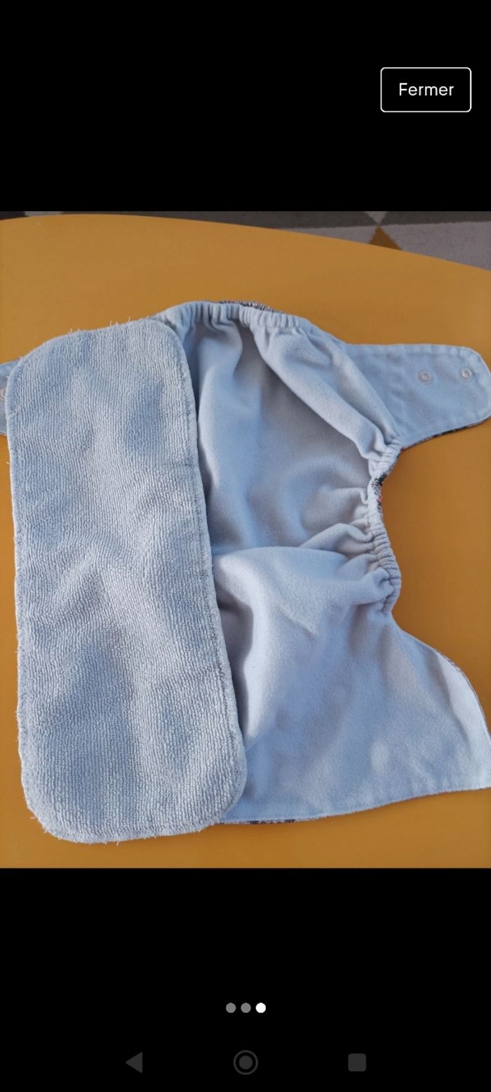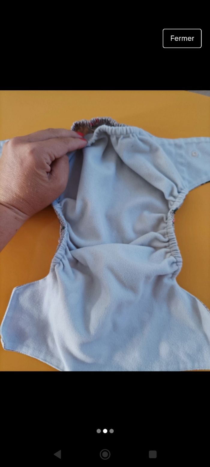 Couche lavable avec possibilité de mettre un insert en plus dedans Servi pour un seul enfant Élastiques en très bon état Pressions en bon état Un décrassage a été fait mais faites en un aussi par sécurité