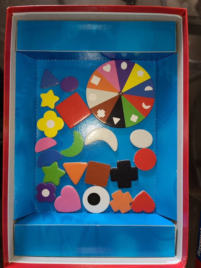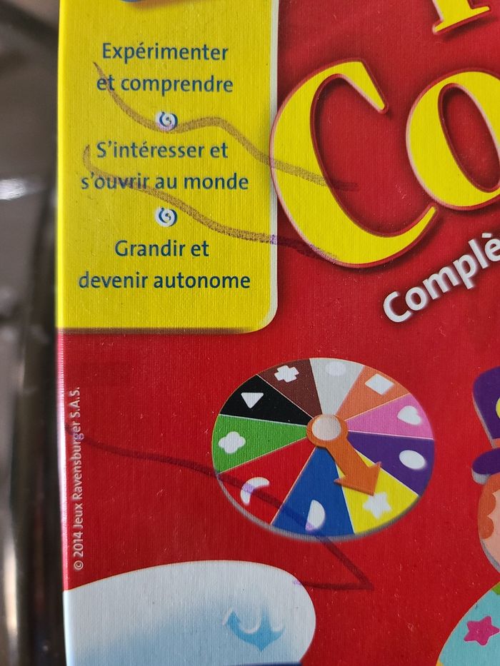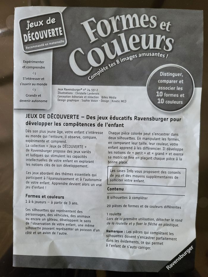 Jeu à partir de 3 ans, en très bon état, pour apprendre les formes et les couleurs. Il y a la notice. Juste le couvercle légèrement abîmé, le coin et des traits de feutre. Voir les 2 dernières photos.