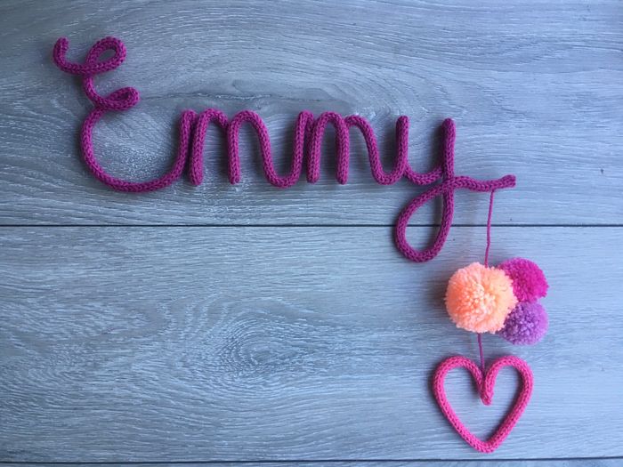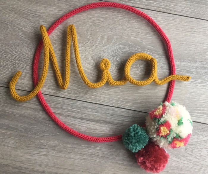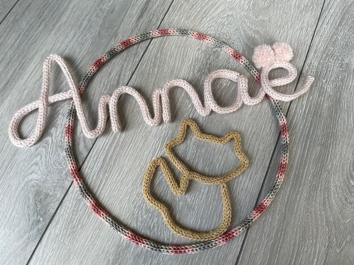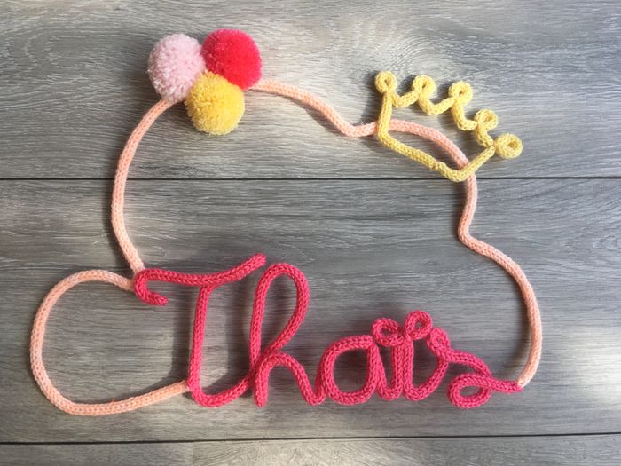 Création en tricotin. Base des tarif: -modèle nuage Elena : 20€ -modèle support avec chat Annae: 17€ -modèle support avec pompons Mya : 15€ -modèle nuage et couronne Thais : 20€ -modèle prénom seul avec pompons et motif : 13€ Choix des couleurs et des motifs 😉 Nombreux modèles de disponibles, photos sur demande.
