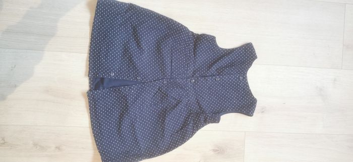 Jolie robe de ceremonie bleu marine et petits poids blancs. 18 mois Fermeture par boutons dans le dos. Culotte bleu marine assortie En parfait état, portée 1 fois. Prix d'achat : 14€ Prix : 2€