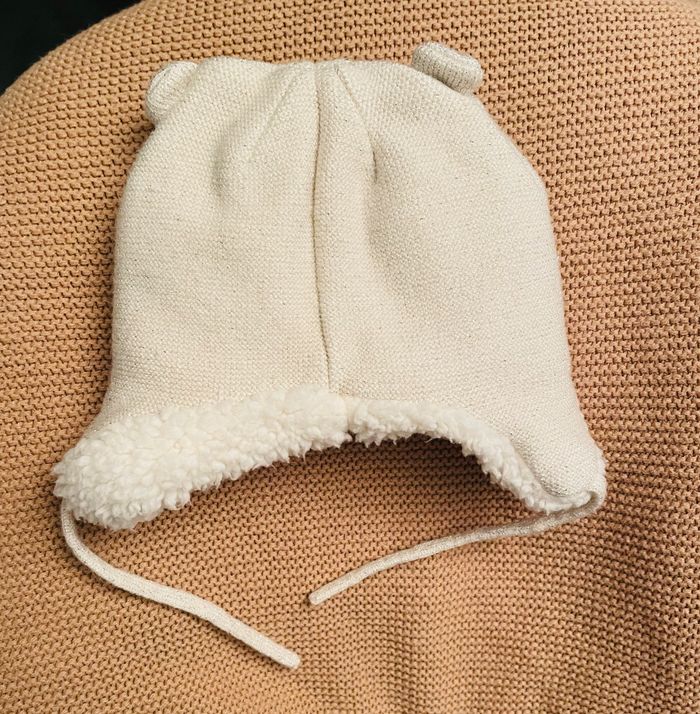Bonnet et moufles bébé fille Double en Sherpa tout doux et bien chaud Écru avec un fil de lurex doré Jamais porté Lavage 1 fois État impeccable