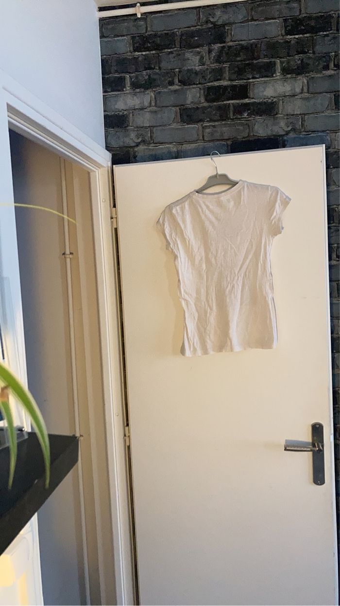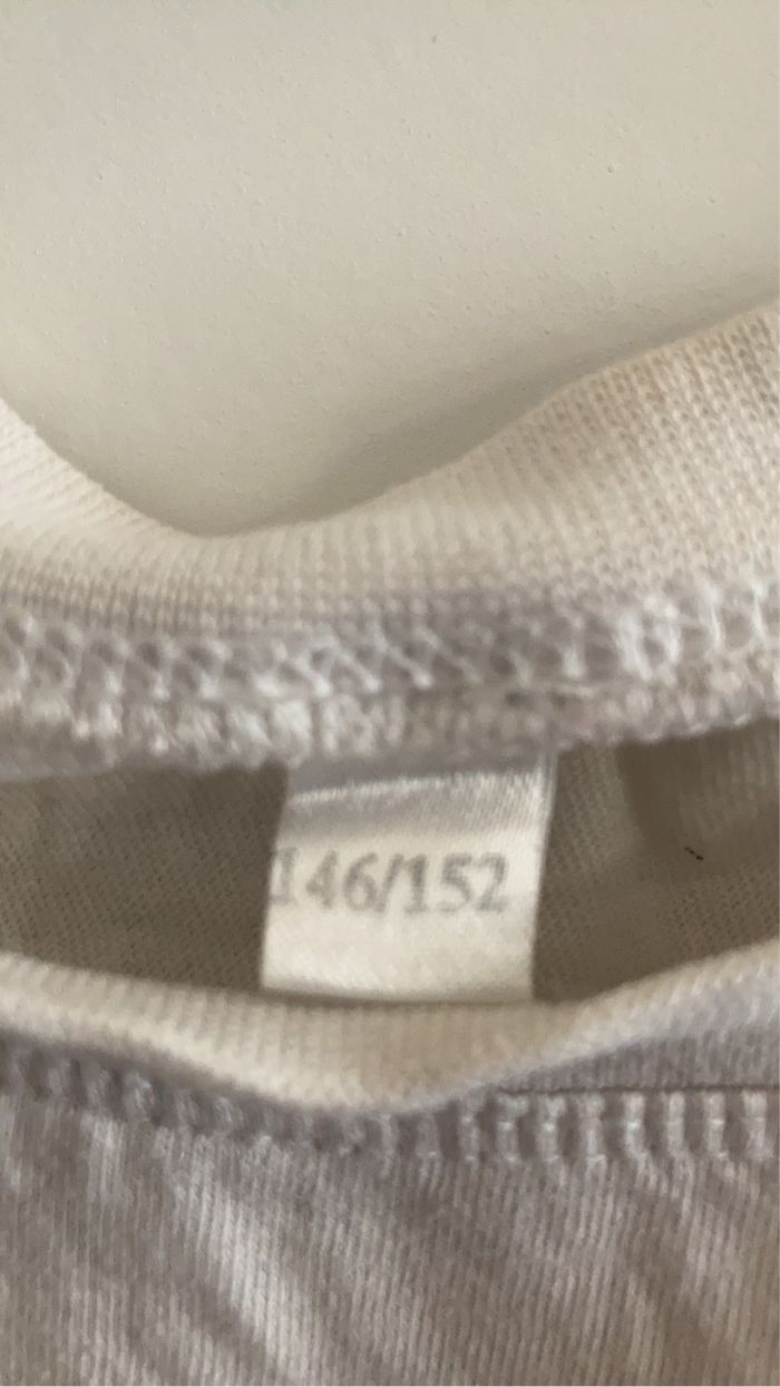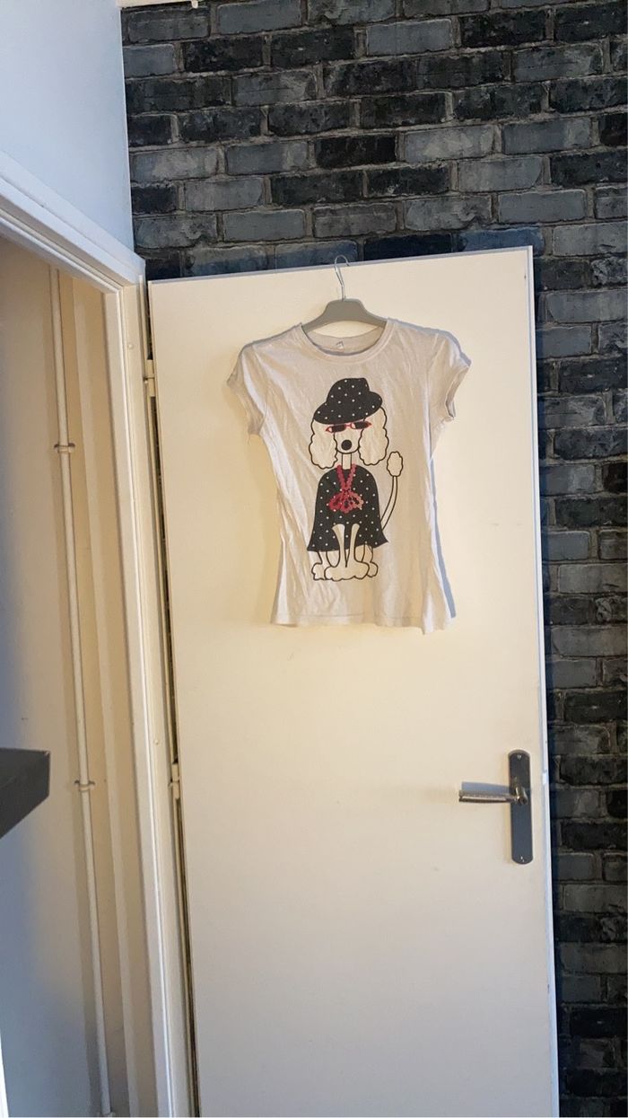 Tee-shirts manche courte de couleur blanche avec un chien sur le devant avec des couleurs noir et rouge. Taille 140/152. Le tee-shirts n’a pas de tâche,ni de trou.