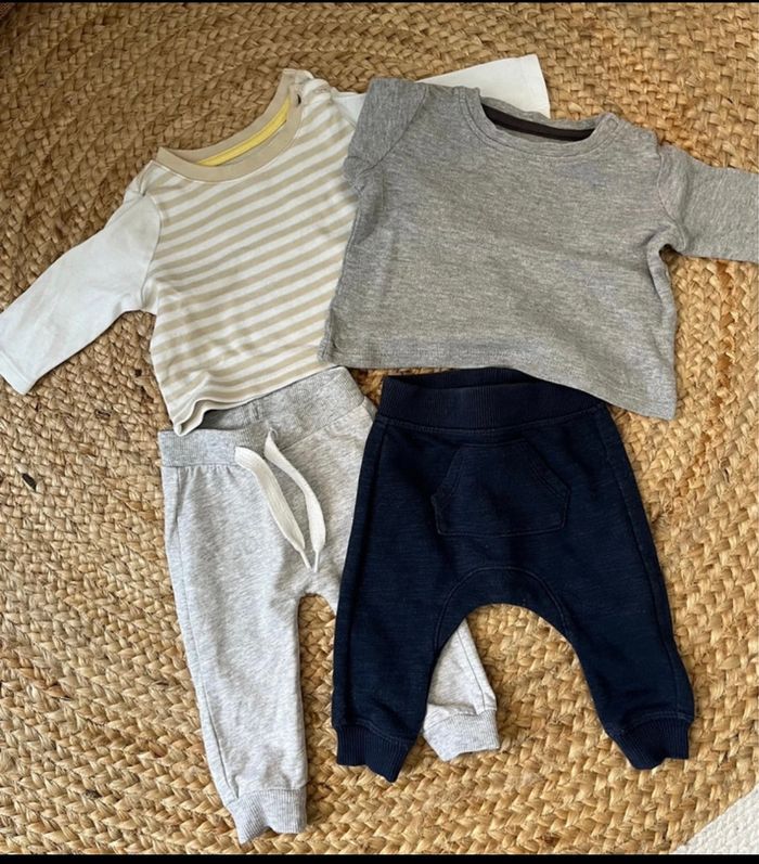 2 pantalons types jogging gris et bleu marine, marque Kiabi. 1 t-shirt manche longue rayé. 1 sweat gris, marque verbaudet. Tout en très bon état. Taille 1 mois.