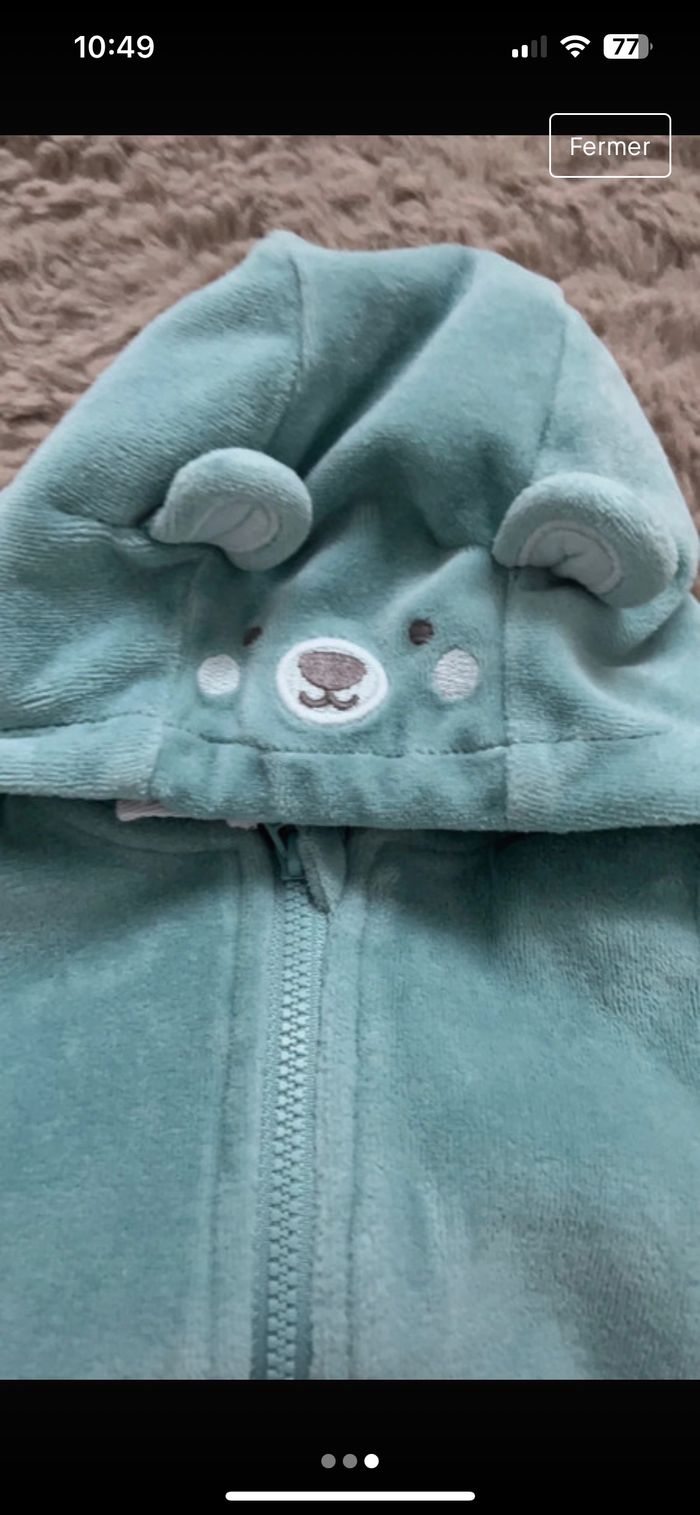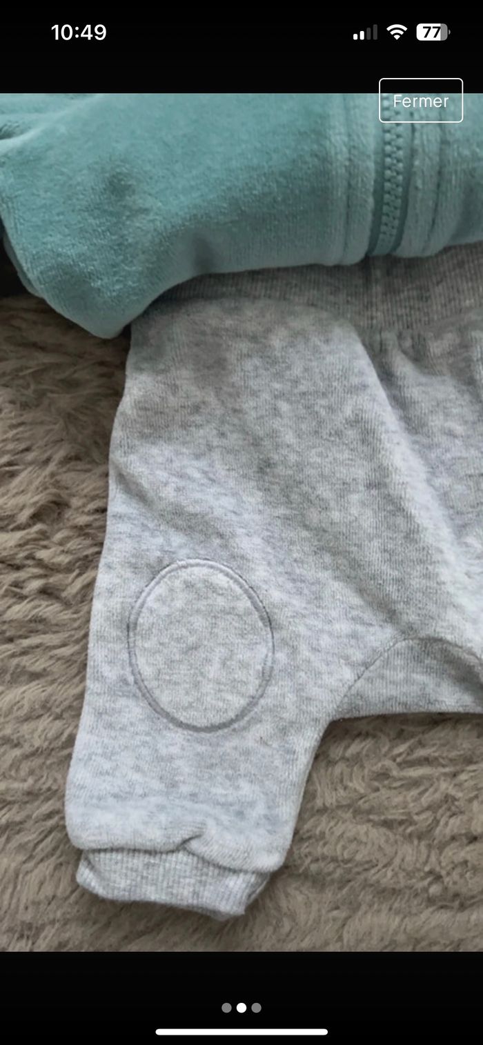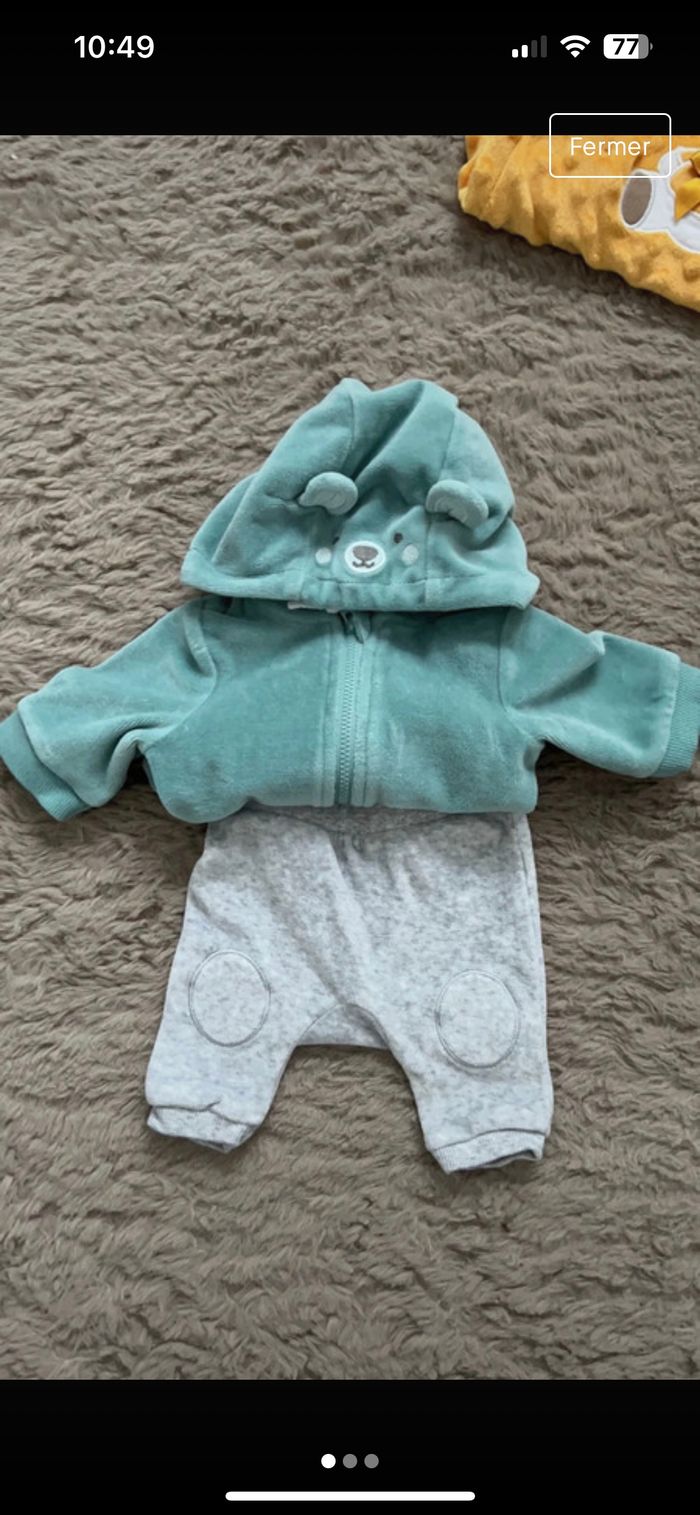 Ensemble bébé : composé d’un gilet + pantalon en velours Taille naissance. Très bon état général Marque orchestra