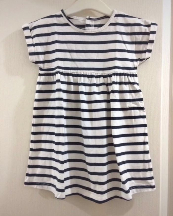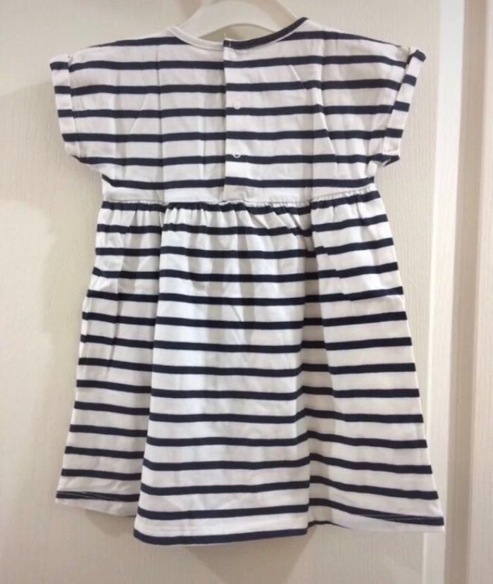 Robe marine, á rayures, blanc et bleu marine, taille 24 mois,marque Bout’chou. Portée deux fois seulement, comme neuf.
