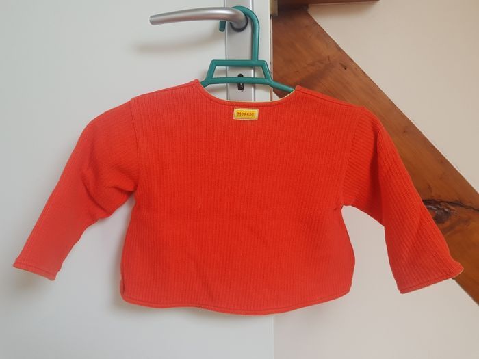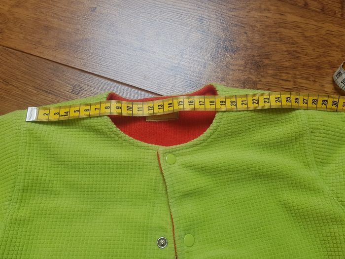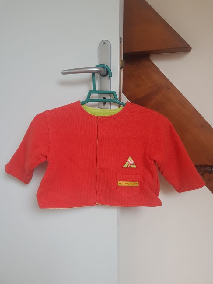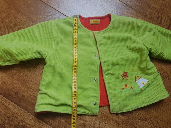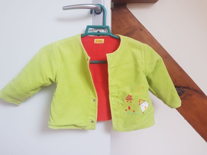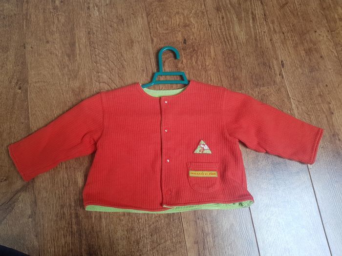 Taille 2 ans ( photos des mesures) Jolie veste printanière réversible, un côté orangé, un autre vert, tous les deux avec motifs brodés. Tissu épais, fermeture boutonnée. En très bon état.