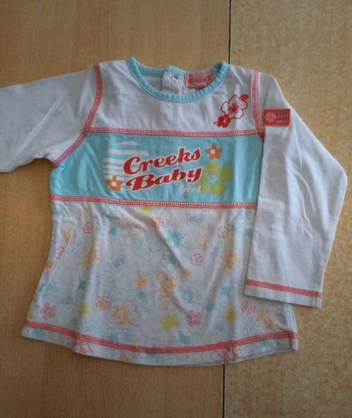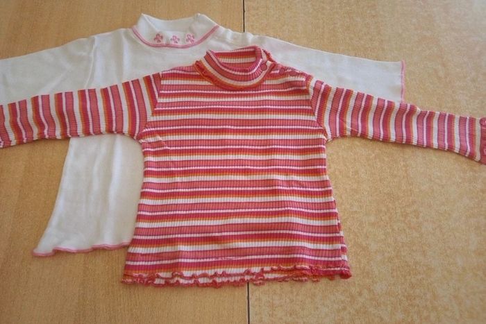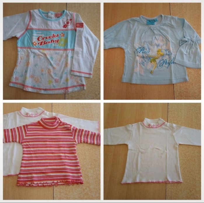 Lot de 4 tee-shirts : - tee-shirt blanc et bleu, marque Creeks. - tee-shirt bleu Disney Fée Clochette (taille petit : 3 ans sur l'étiquette mais plutôt 2 ans). - lot de 2 tee-shirts à col montant, 1 crème et 1 rayé rose. En très bon état. Taille 2 ans.
