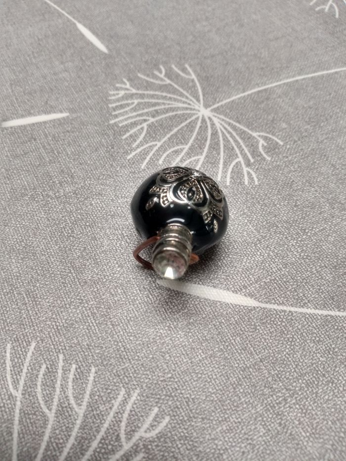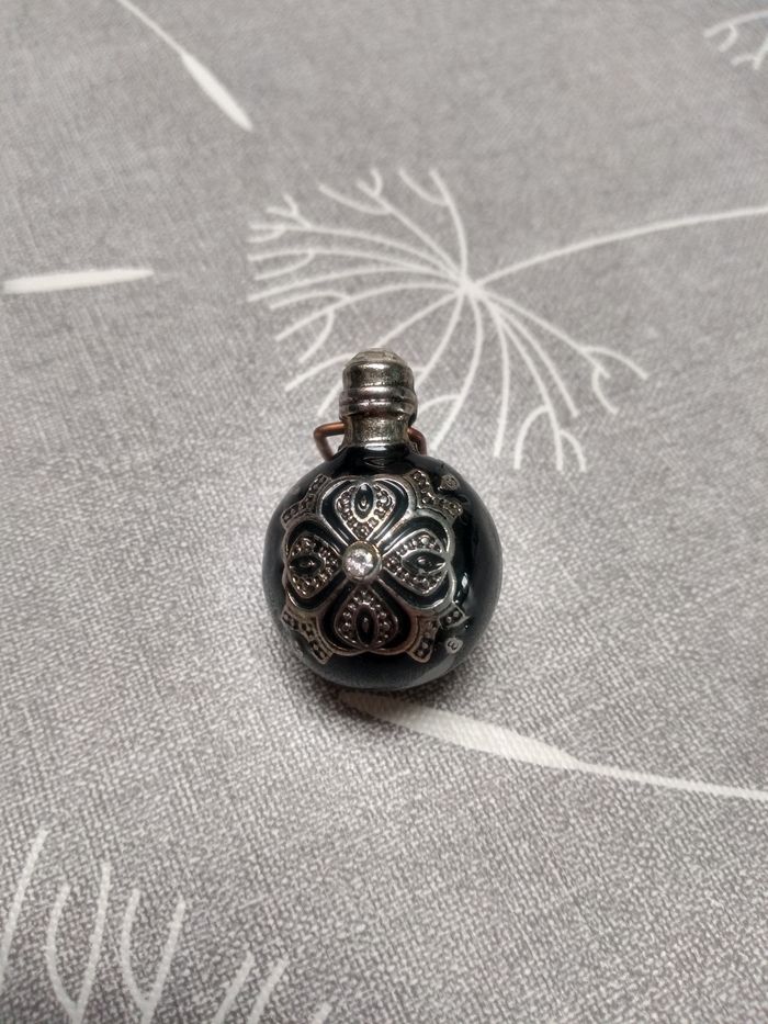 Pendentif en forme de fiole. Argenté et noir. Diamètre : 2,2 cm. Très bon état.