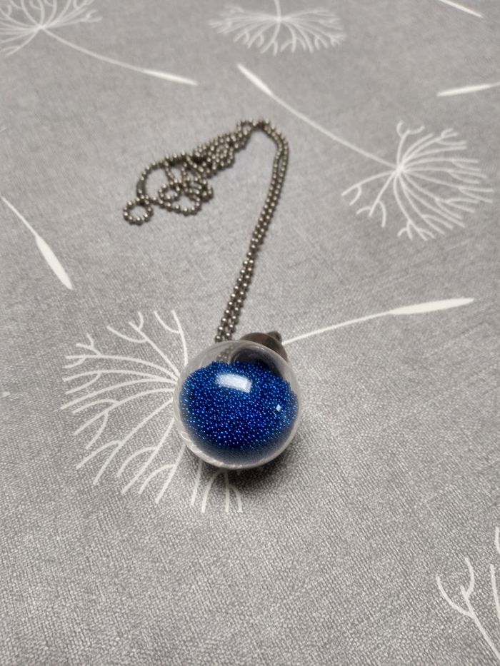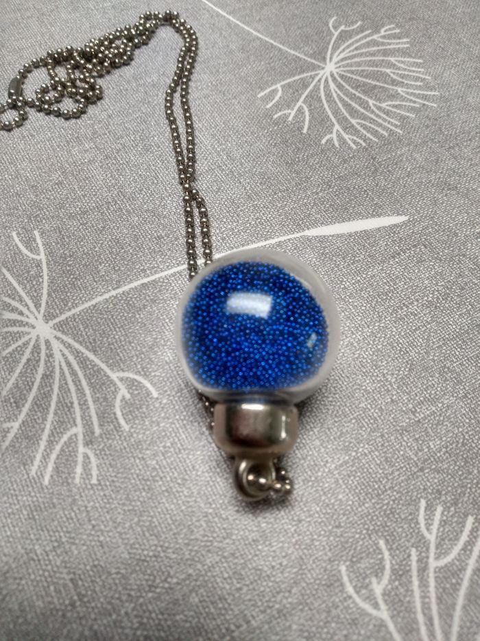 Collier avec boule transparente remplie de petites billes bleues. Longueur: 36 cm. Diamètre boule : 2,5 cm. Neuf