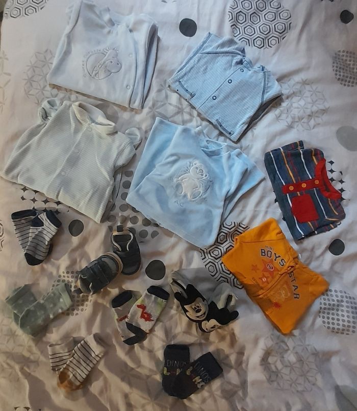 Lot vêtements bébé garçon 1 mois en trés bon état 1 T shirt manches longues primark 1 mois 1 Petit veste jaune kitchoun 1 mois 1 Ensemble pyjama avec bonnet prénatal 1-3 mois 1 Pyjama deux pièces marque ac 1 mois 1 Pyjama C&a 1 mois 1 Barboteuse manches longues my first wardrobe 1 mois 1 paire chaussures bébé kiabi 1 paire chaussons Mickey kiabi 5 paires de chaussettes kiabi