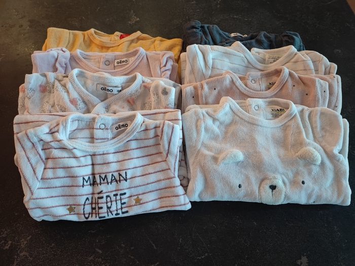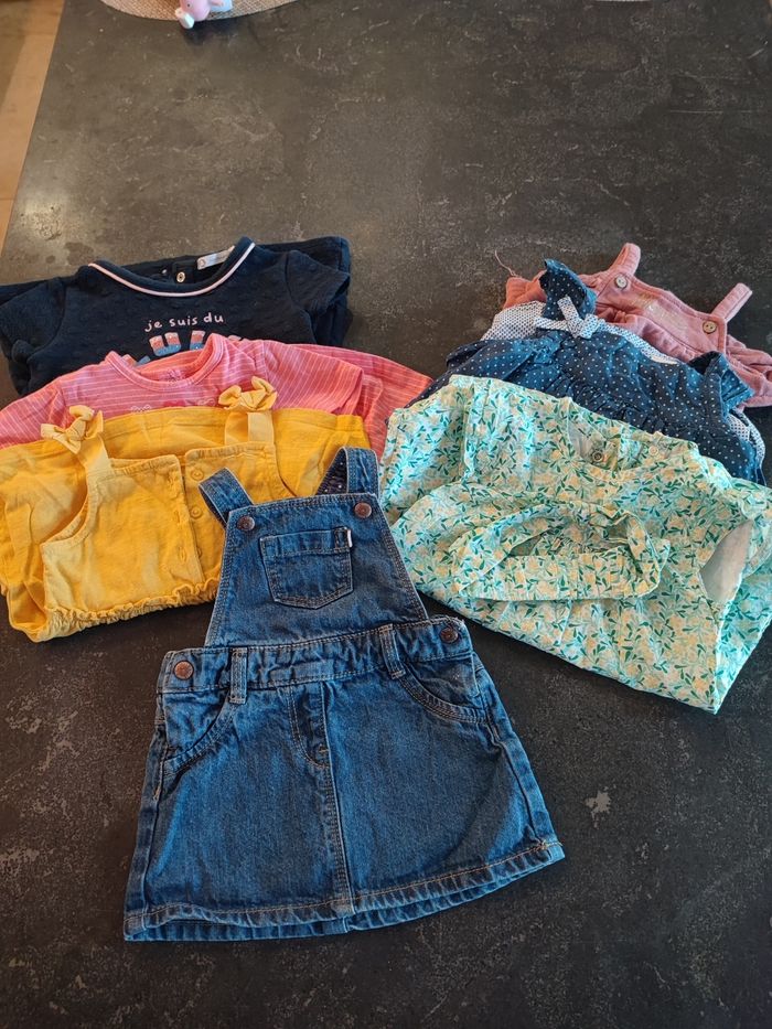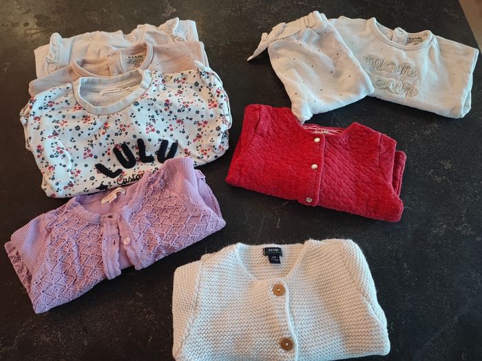 Lot de vêtements bébé en 6 mois en très bon état. Différentes marques : Gémo, Verbaudet, Kiabi, lulu castagnette... 8 pyjamas+ 9 t-shirt manches longues+ 9 bodys + 1 cape manteau+ 1 salopette+ 6 robes + 1 ensemble jogging+ 3 pulls + 3 gilets + 9 bas.