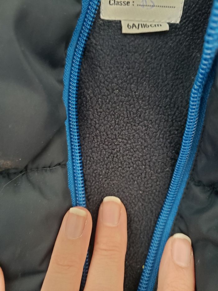 Manteau bleu 6 ans un peu abîmé au haut de la fermeture ,bon etat sinon ,la fermeture fonctionne toujours