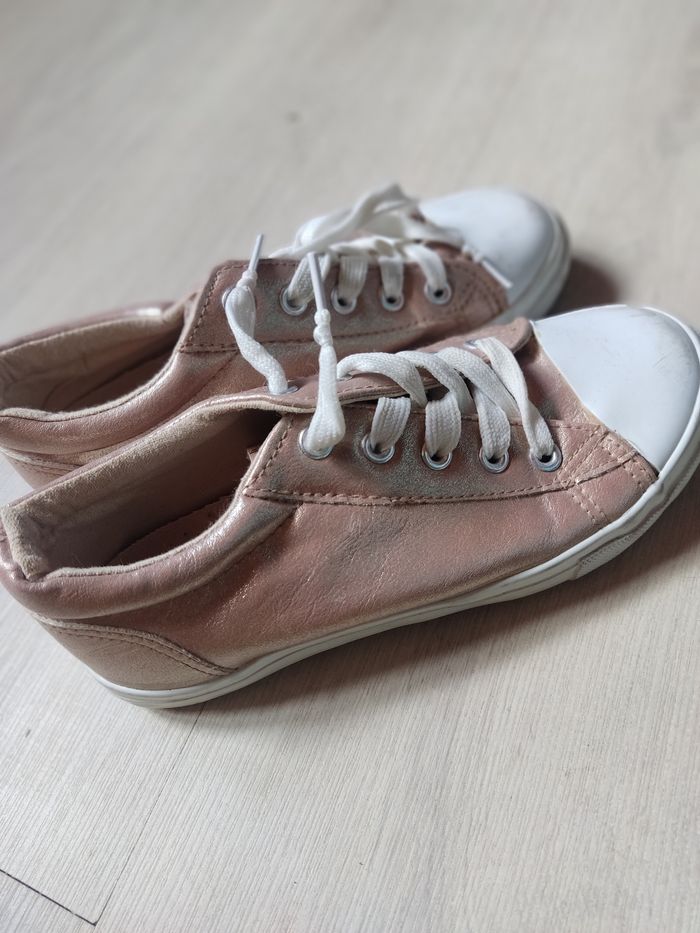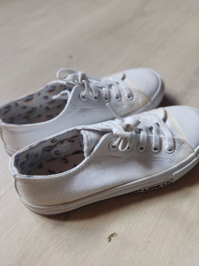 Légèrement abîmé mais peut encore servir. Les blanches ont jauni sur le tour de la chaussure. Voir photo