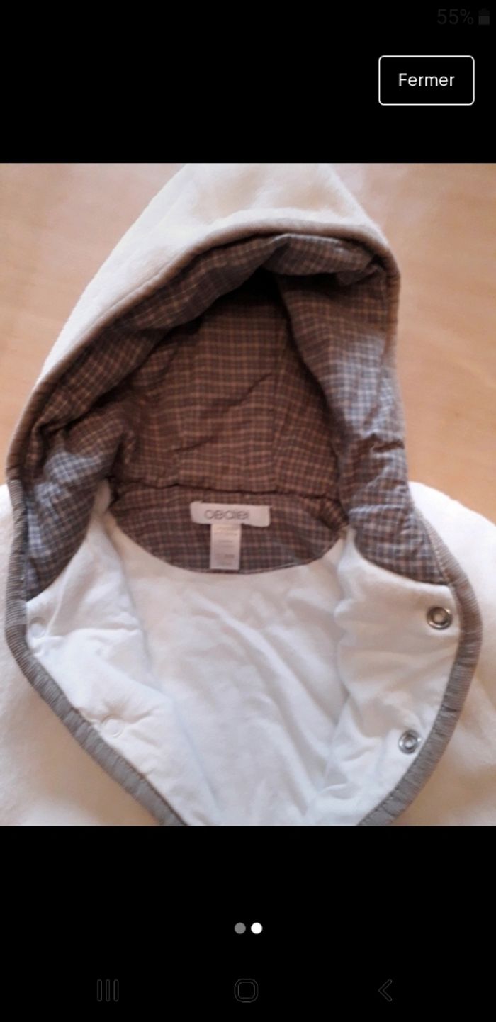 Vends manteau couleur blanc avec capuche, intérieur matelassé et extérieur polaire, bébé garçon ,taille 12 mois, marque obaibi, très bon état propre, prix 3 €